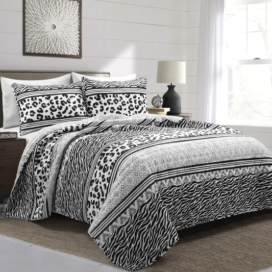 Animal Global Reversible 3 Piece Quilt Set, King, Black White