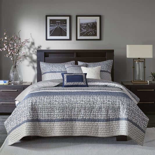 Quilt Set Luxurious Jacquard Stripes Design All Season, Coverlet Bedspread Lightweight Bedding Layer, Shams, Decorative Pillow, King/Cal King(104"x94"), Chevron Navy 6 Piece