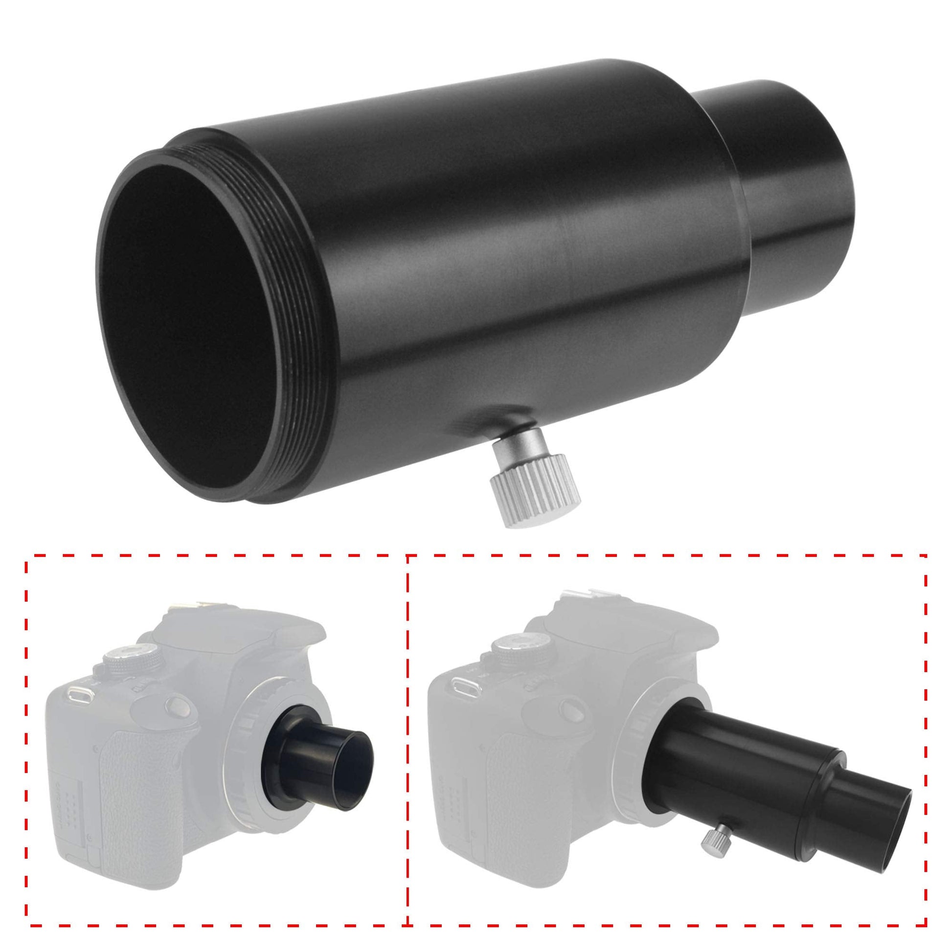 The 1.25" Universal Camera Adapter allows attachment of a camera body to reflector and refractor telescopes for either -focus or eyepiece-projection photography (hence the term universal). The adapter slides into the eyepiece holder as an eyepiece normally would. This universal adapter is composed of two detachable parts a -focus adapter (or T-adapter) for -focus photography, and a fixed-length tube for eyepiece-projection photography. A thumbscrew in the fixed-length tube holds the telescope eyepiece in place. This combination of -focus and eyepiece-projection camera adapter has a non-variable barrel design that allows a fixed projection distance for eyepiece-projection photography. Fits reflector and refractor telescopes with 1.25" telescope eyepiece holders. This Standard Universal Camera Adapter is precision made of black-anodized aluminum and is compatible with 1.25" telescope focusers and many 1.25" telescope eyepieces (some eyepieces have housing diameters that are too large to fit inside the adapter). The barrel of the adapter is threaded for filters.