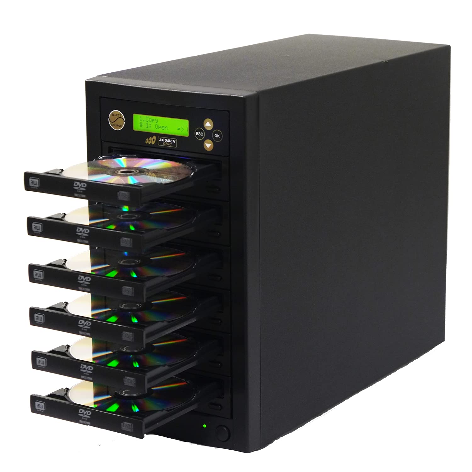 has a copy system that fits your needs. This Duplicator unit features Asus burners for writing blank media discs with a reader rom for master . Duplicator that can easily backs up your digital files including photos, music, documents, data, and more. The professional duplicator from does it all at lightning speeds up to highest level for DVD burning. No computer or software needed, no setup required, and no confusing buttons to push, it automatically starts and finishes the job. The LCD display panel is an easy read display with 2 line. Our Duplicator are a reliable, professionally built system that is easy to use. All you need to do is putting in the discs. Accessing, storing, and sharing digital files has never been this easy and fun. duplication doesn't have to break the bank or tie up a computer. This 1 reader with multiple burners duplication system that is designed for users who need to do multiple copies with the needs to get jobs done in short amount of time massive. It is a complete stand-alone system so you can use it anywhere that you have power. Just plug it in, insert your source and target discs and let the drive take care of the rest. Fitted with a user-friendly LCD interface, the copy tower burns CD and DVD discs at an optimal speed every burn cycle. Burning speeds are adjustable and other standard menu features are available for advanced users. Our duplicators are easy to use and are the best value in the market. has the solution for all your duplication needs. IMPORTANT NOTE: Our Duplicators does not copy any Encrypted, Copyright, Copy Protected DVDs/CDs, and Video games. Including store bought or rental discsFeaturesDuplicate up to 5 Discs in to DuplicationMax Write Speed: DVD +/- R 24x, CD-R 52x, DVD +/-R DL 12x