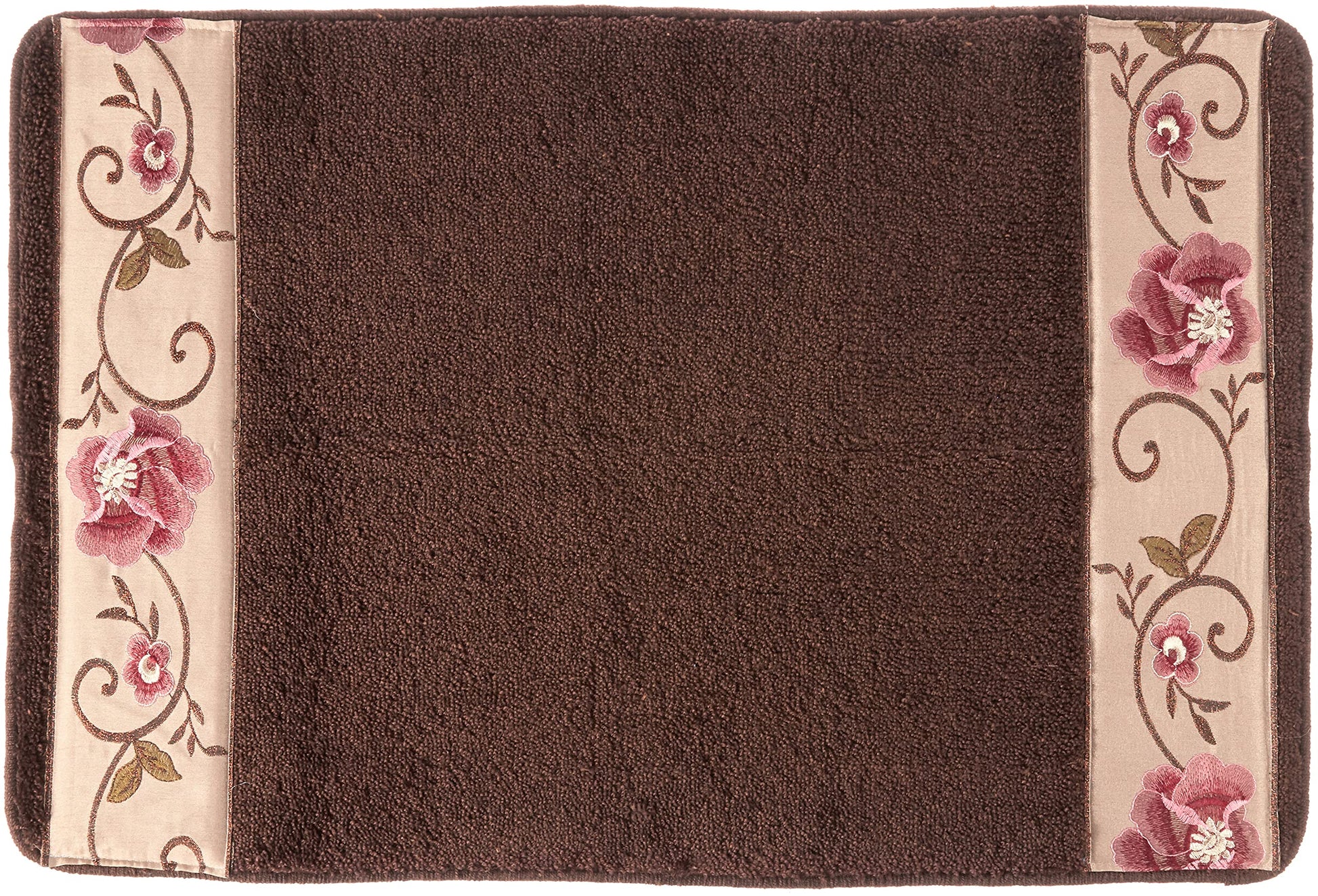 This rug from the Larissa Collection measures 21" x 12" and features a beautiful rose design. It is part of a coordinated set that includes a shower curtain, shower hooks, wastebasket, tissue, tumbler, soap dish, toothbrush holder, lotion pump, a three-piece towel set, and a contour rug. The design is fashionable and adds a modern touch to any bathroom or spa setting. Crafted to complement the other items in the collection, this rug enhances the overall aesthetic with its elegant rose motif. Its size makes it a versatile addition to various bathroom spaces, providing both style and functionality. The coordinated design ensures a cohesive look, making it easy to create a stylish and inviting bathroom environment.