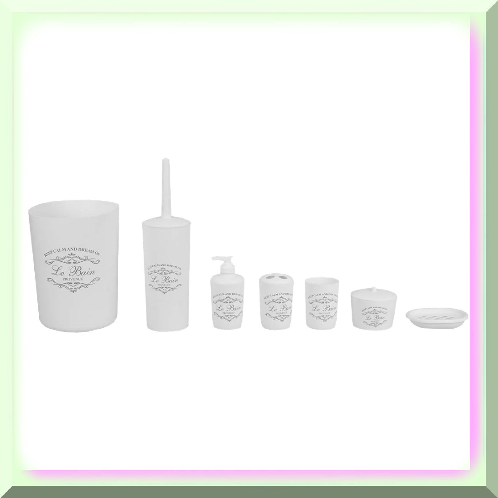 This 7-piece bathroom set includes a tumbler, toothbrush holder, soap dish, lotion dispenser, cotton ball holder, tissue holder, and wastebasket. Crafted from sturdy plastic, each piece features elegant French provincial-inspired script, adding a touch of sophistication to your space. The tumbler can be used for rinsing or drinking, or to organize pens and small office supplies on your desk. The toothbrush holder helps keep your vanity tidy, while the soap dish provides convenient storage in the shower. The lotion dispenser is ideal for sinkside use, adding a charming accent to your bathroom or kitchen. The cotton ball holder keeps small items organized, and the tissue holder offers a stylish way to store tissues. The wastebasket neatly contains clutter in any corner. This set combines decorative appeal with practical function, enhancing your bathroomโs ambiance with a touch of Parisian elegance.