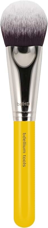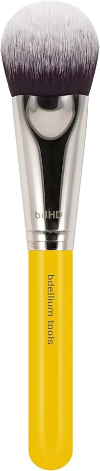 This professional makeup brush features soft synthetic fibers designed for smooth application and blending of foundation and powder. Its large, rounded head allows for even coverage and seamless blending across the face. The brush's durable construction ensures reliable use, making it suitable for both professional and personal makeup routines. The bright yellow handle provides a comfortable grip, facilitating precise control during application. Ideal for achieving a natural, flawless finish, this brush is a versatile tool for makeup enthusiasts and professionals alike.