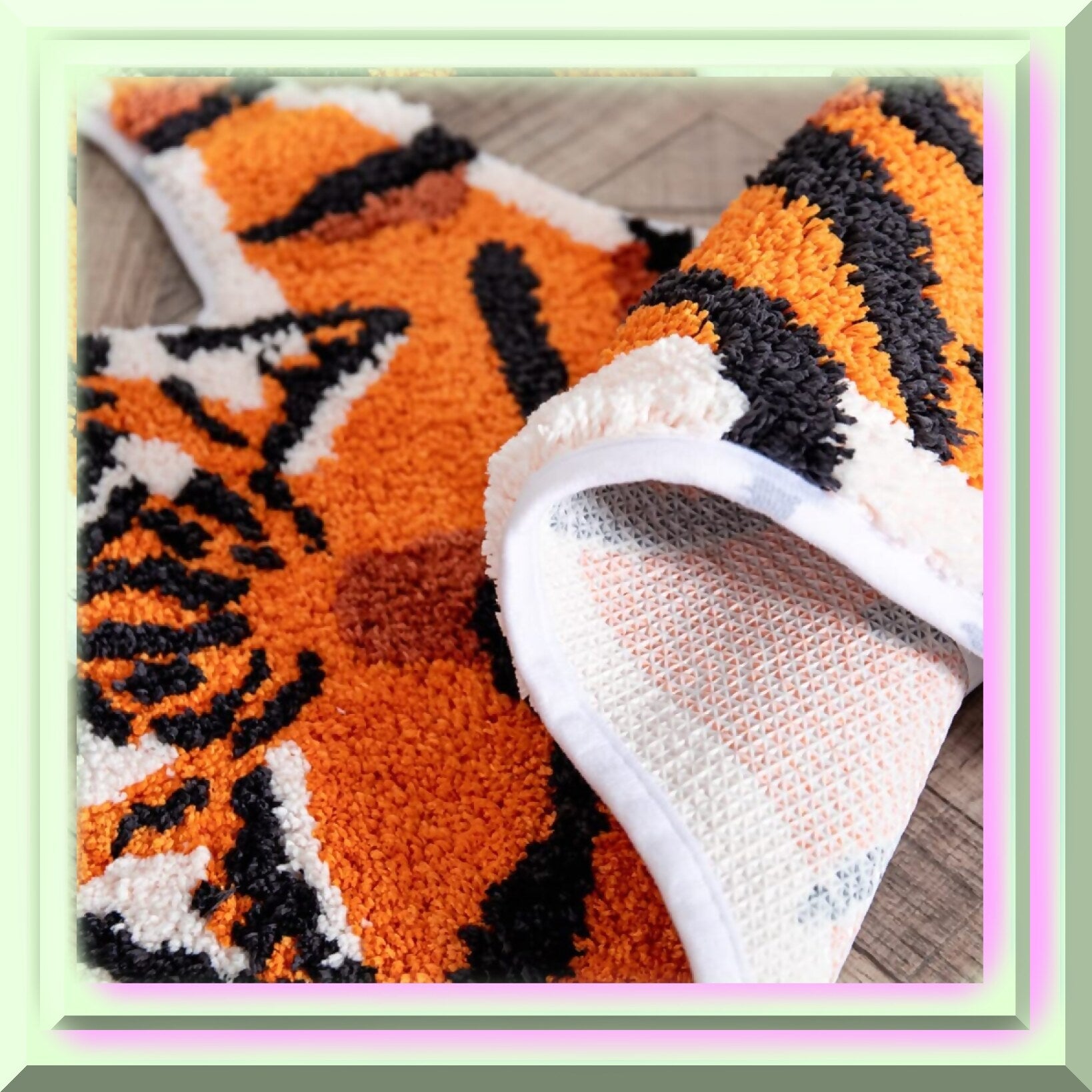 This tiger-shaped rug measures 65x98cm (25.6x38.6in) and features a cute cartoon tiger design with advanced printing for a charming visual appeal. Made from soft polyester plush, it offers durability and wear resistance without damaging floors. The backing is crafted from suede material with precise small grooves to prevent shifting and skidding, ensuring safety during use. Its high water absorption capacity, thanks to ultra-fine fibers, allows it to absorb water instantly, keeping the surface dry even after repeated use. Suitable for various areas such as bathrooms, bedrooms, living rooms, kitchens, hotels, laundry rooms, and bay windows, this rug combines functionality with playful design. Please note that manual measurement may result in a 2-3cm error, and transportation may cause slight folds that do not affect usability. Color differences may occur due to lighting, monitor settings, or dyeing processes.