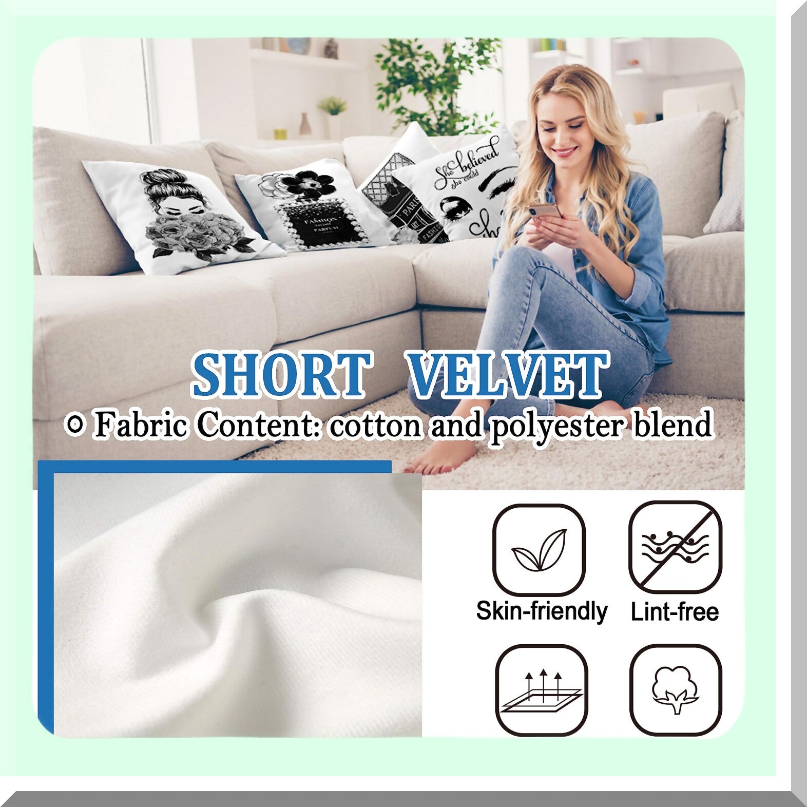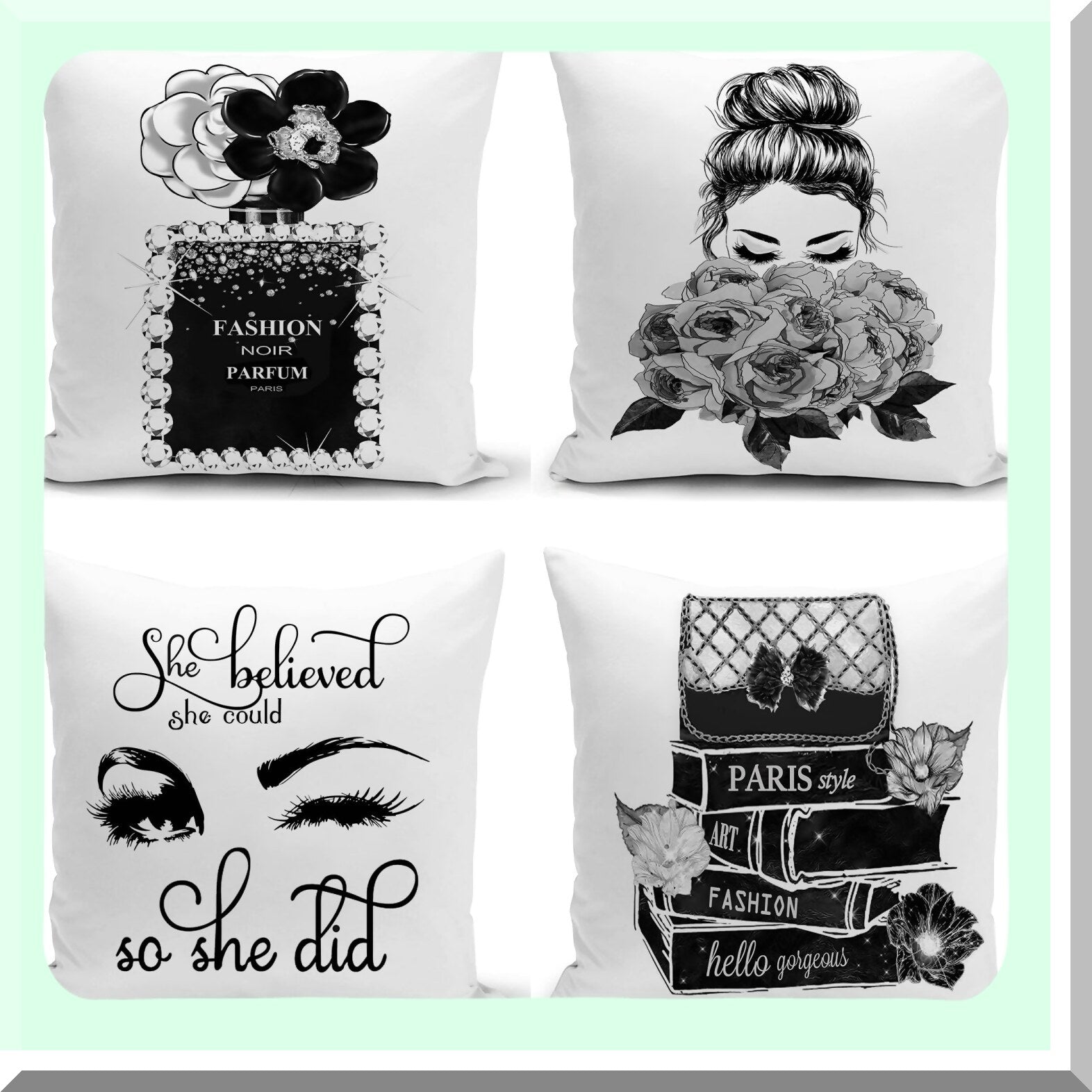 Bling Perfume Lashes Pillow Covers - Set of 4 Fashion Girls High Heels Sayings Gray Flowers Decorative Throw Pillow Covers - Black White Accent