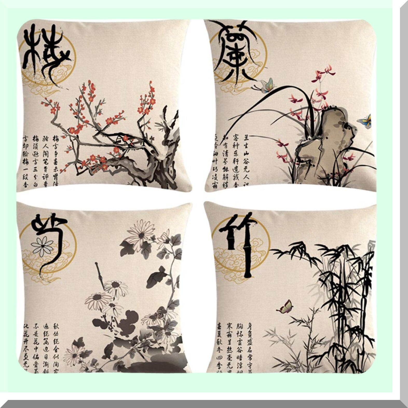 Chinese Culture Floral Pillow Cover Set - Plum Blossom Chrysanthemum Orchid Bamboo Ink Wash Painting Cushion Covers with Calligraphy - 18x18 inches, 4 Pack