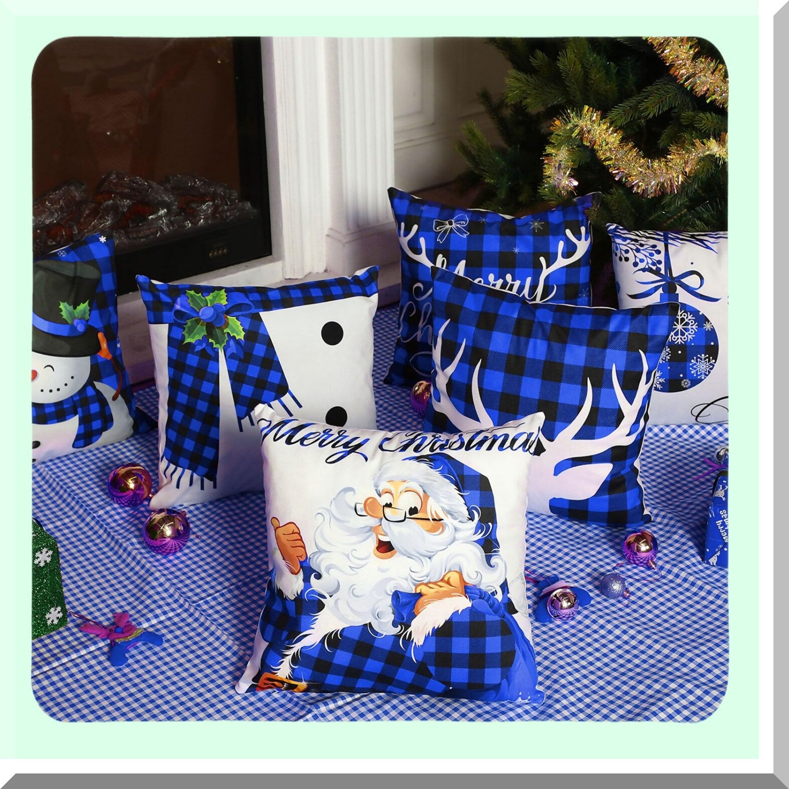 Winter Wonderland Buffalo Plaid Pillow Covers - Set of 6 Holiday Throw Pillow Cases for Xmas Decorations in Black and Blue - 18 x 18 Inch Sofa Couch Bedroom Decor