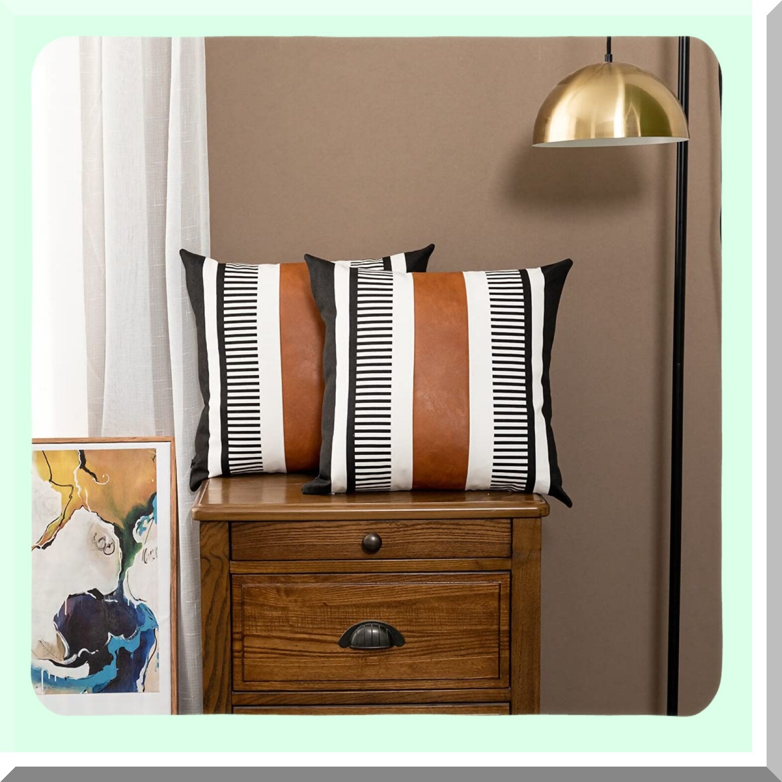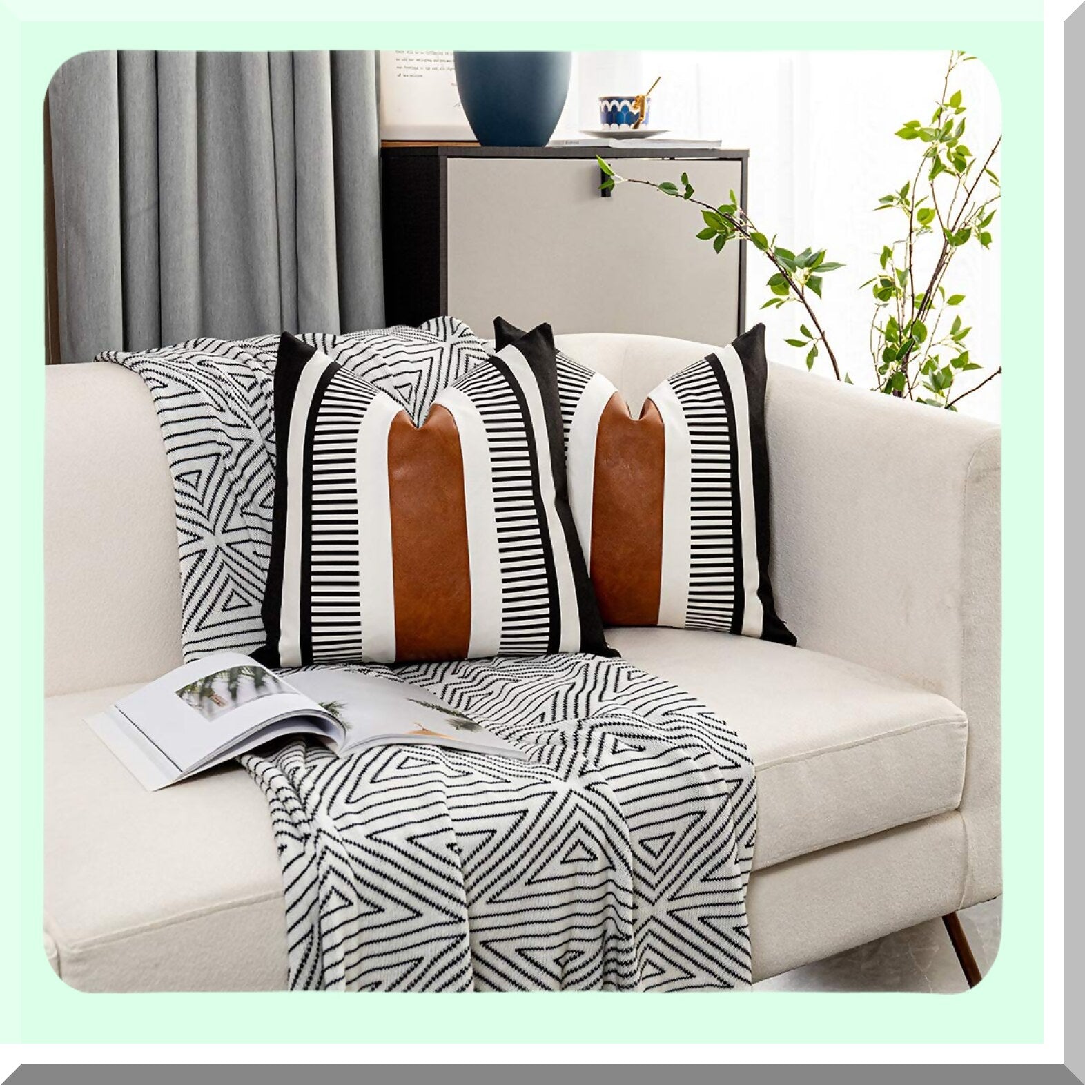Farmhouse Stripe Leather Accent Pillow Set - Black & White 26x26 Decorative Pillowcase for Sofa, Couch, Chair, Bedroom - Modern Home Decor - Pack of 2