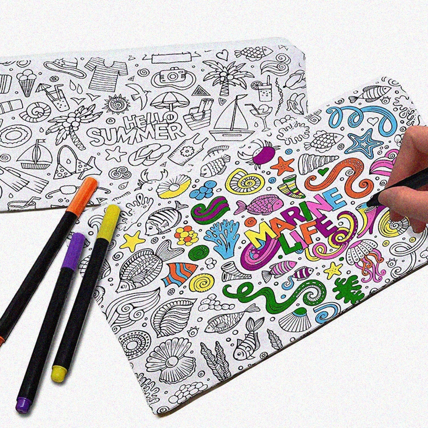 This set includes two double-sided zipper bags, one large and one small, along with six fabric markers. The large pouch measures 10 inches by 7 inches, suitable for holding a tablet, books, or other items, while the small pouch measures 8.5 inches by 4.75 inches, ideal for pencils, phones, or cosmetics. Both pouches feature colorful illustrations of beach vacation and sea creature images designed for coloring. Kids can enjoy coloring the designs using the included fabric markers in blue, green, orange, pink, purple, and yellow. These pouches encourage imaginative and creative play while providing functional storage options. The large pouch can serve as a book sleeve or tablet holder, and the small pouch can be used as a pencil case or cosmetic bag. Perfect for kids who love arts and crafts, travel, or school supplies, this bundle offers hours of creative fun and practical use.