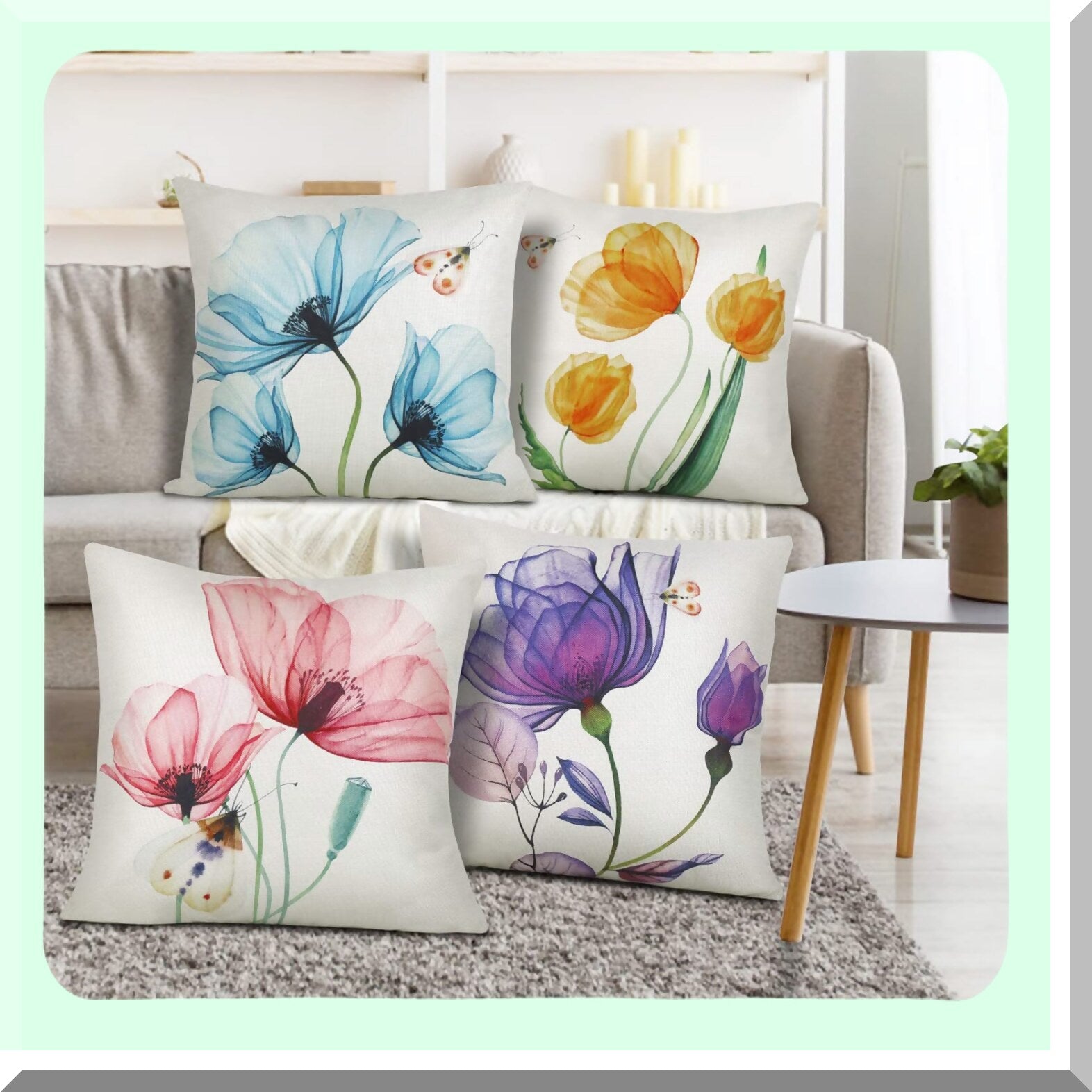 These decorative throw pillow covers, sized 18x18 inches, feature watercolor floral designs in pink, yellow, purple, and blue. They are ideal for enhancing the aesthetic of couches, sofas, and home decor with a farmhouse style. The set includes four pieces, allowing for coordinated decoration. The covers are practical for updating the look of a room without needing to replace entire pillows, offering a cost-effective and versatile solution for home decor.