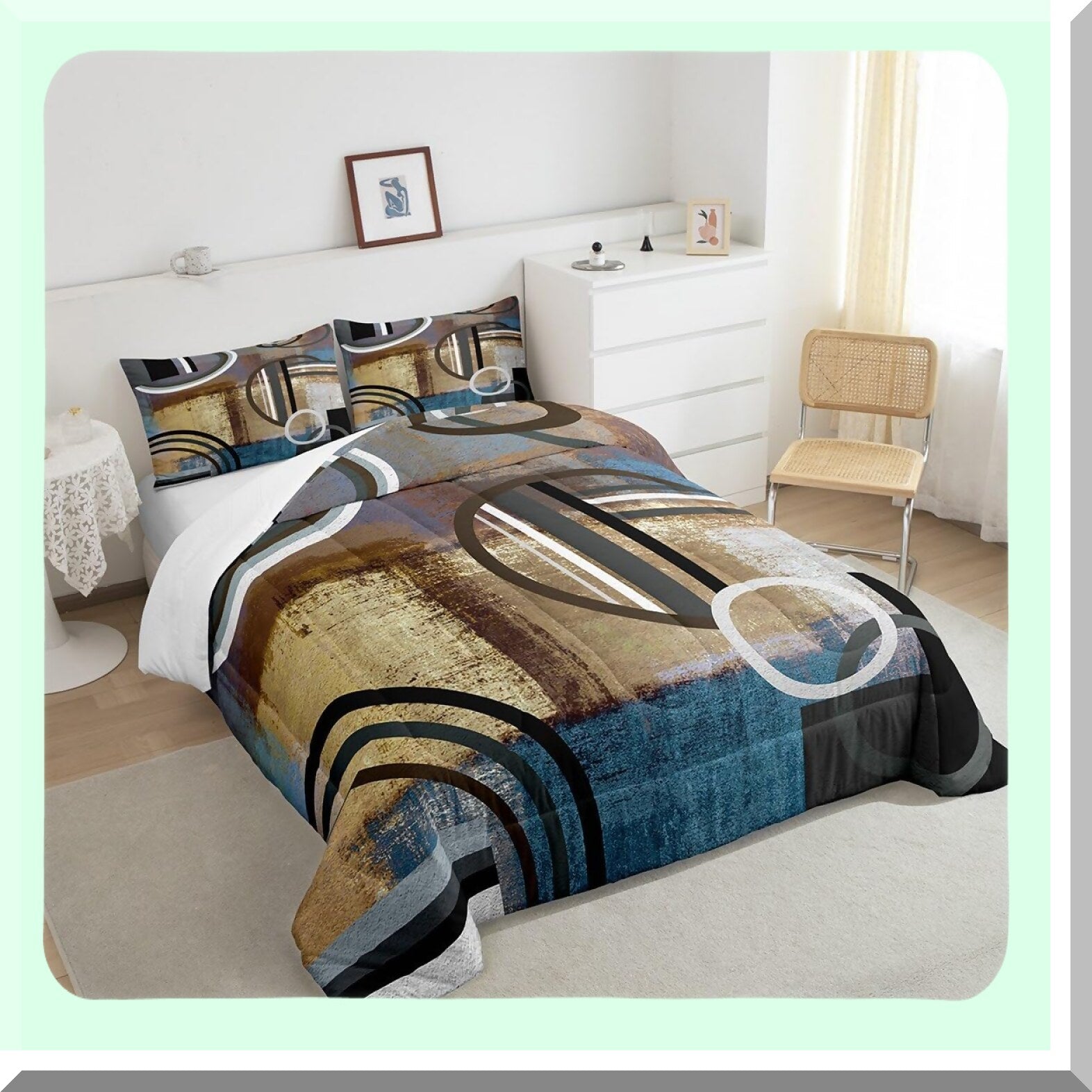 Geometric Grunge Comforter Set - Abstract Painting Style Bedding - Retro Vintage 3 Piece Duvet Set - Brown Black Blue Grey Swirls Stripes Down Comforter - Geometry Bedding Collection