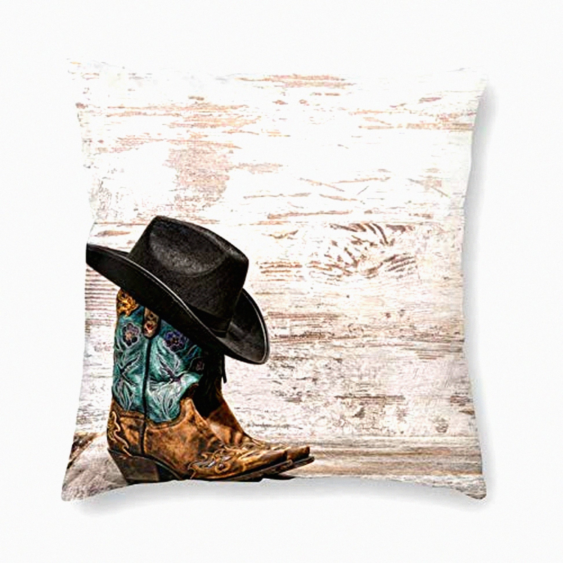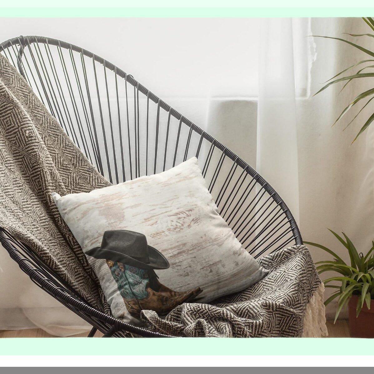 Rustic Western Cowboy Boots and Hat Decorative Pillow Covers - 18x18 Inch Square Cushion Case for Sofa, Couch, Bedroom, Patio - Standard Pillowcase