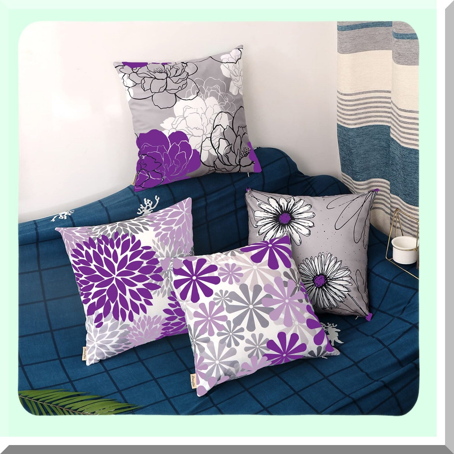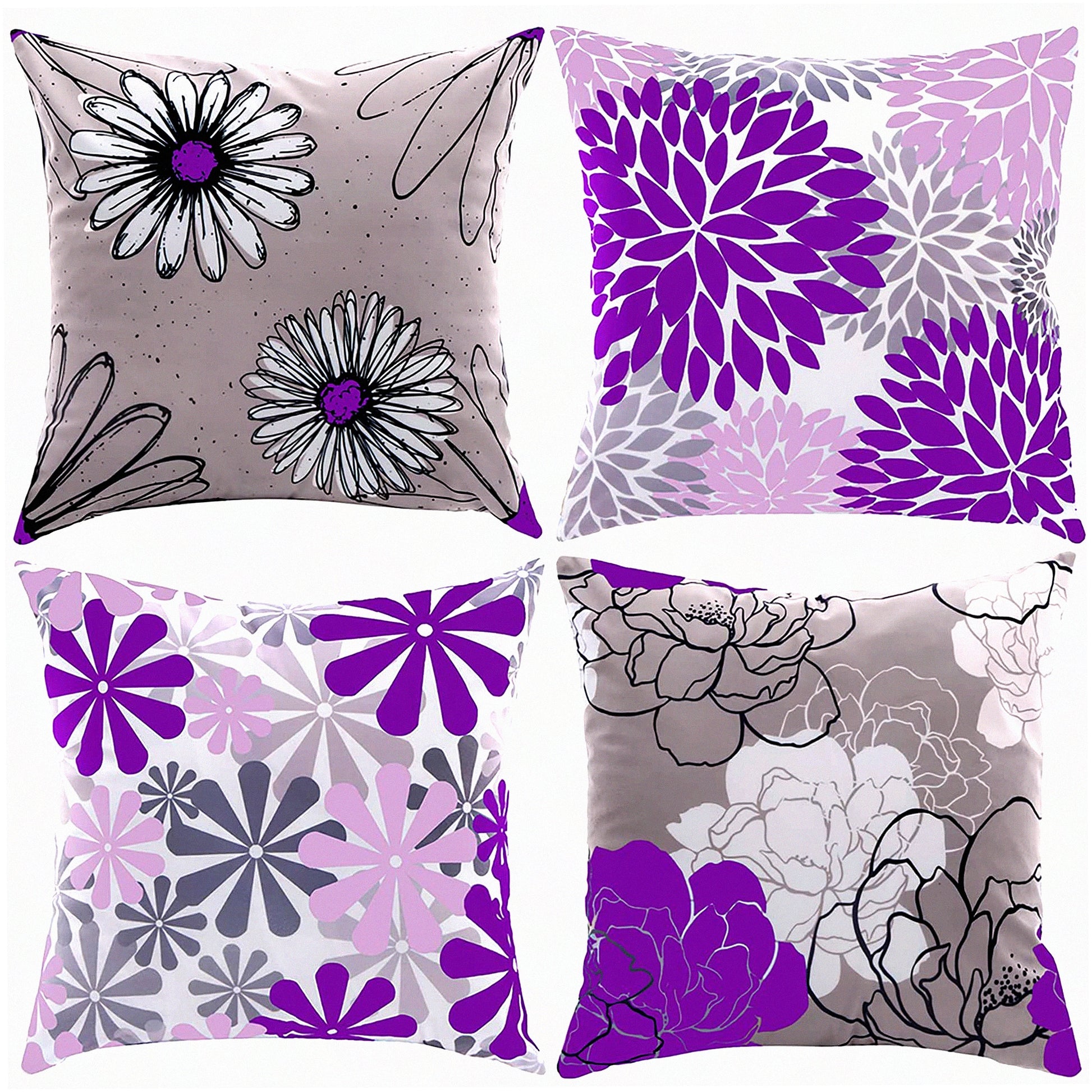Floral Bliss Double-Sided Throw Pillow Covers - Set of 4 Purple Grey 20x20 Inches - Modern Accent Decorative Cases for Living Room Sofa Bedroom Car