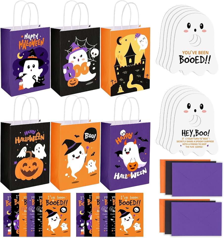 This Halloween ghost kit includes 120 pieces, featuring 30 ghost figures, 30 gift bags, 30 greeting cards, 30 doorknob hangers, and 30 envelopes. It is designed for sharing festive cheer with neighbors, coworkers, and friends. The set provides everything needed to create fun and memorable Halloween surprises, making it easy to spread holiday spirit during the season.