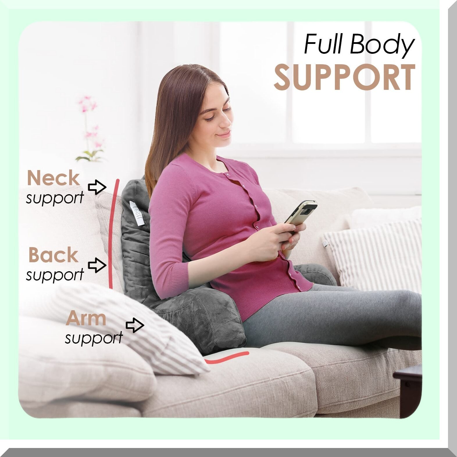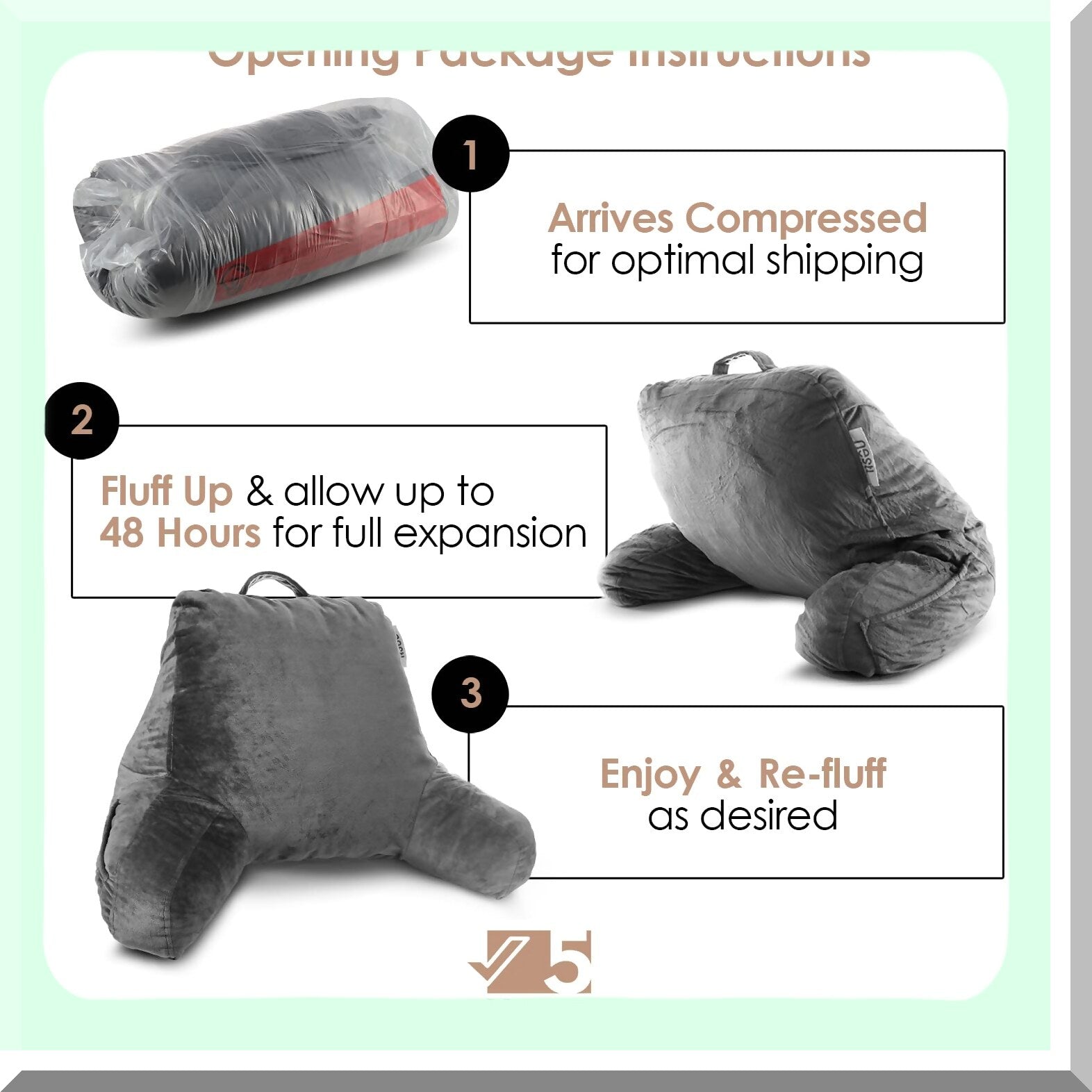 MemoryFoam Comfort Rest Pillow - Grey Bed Chair Arm Support with Pockets - Reading & Sitting Back Pillow for Standard Bed - Shredded Foam Chair Pillow