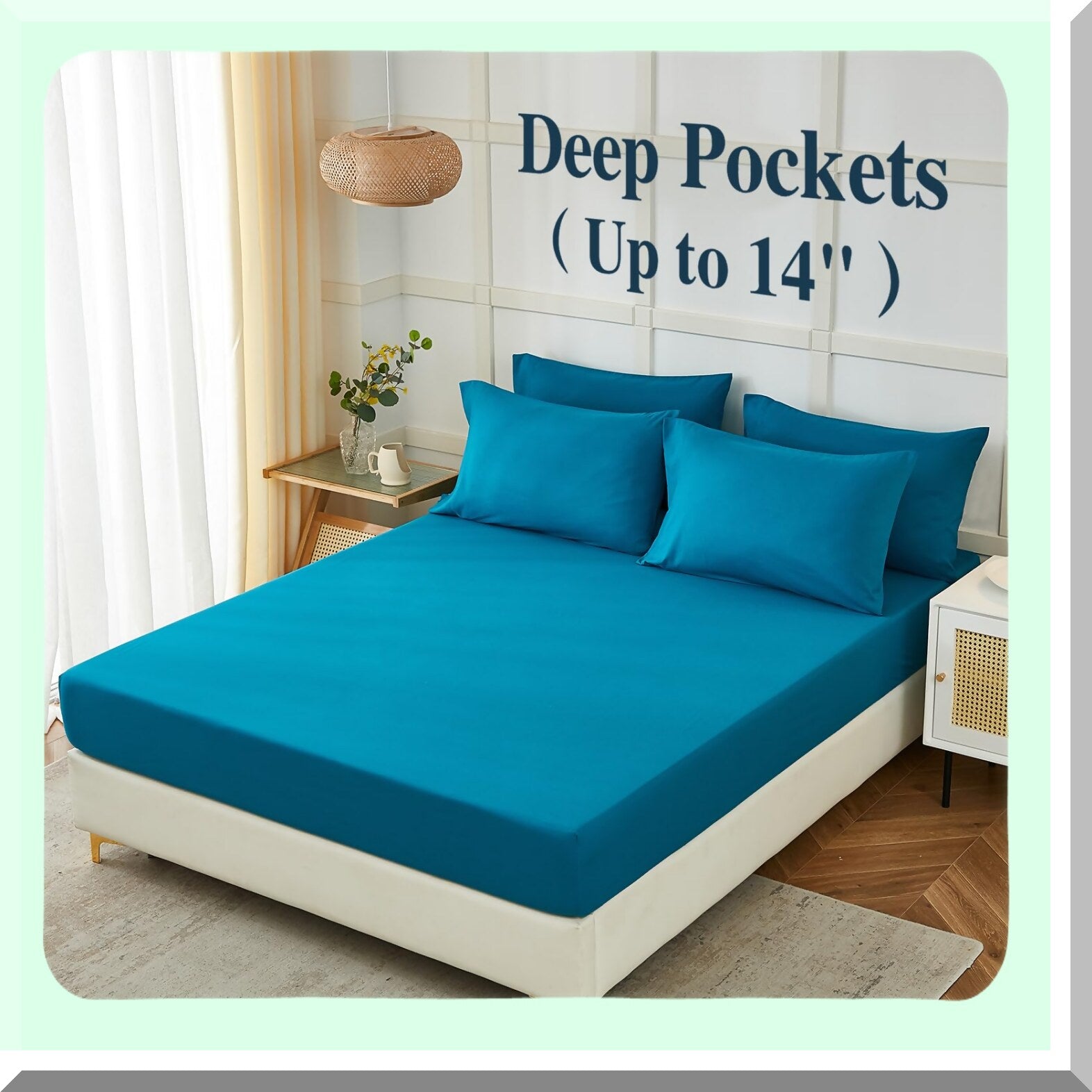 The 6 piece luxury teal queen sheet set is made of high-quality double brushed microfiber, ensuring ultra softness and durability. The exquisite stitches workmanship adds to the luxury feel of the set. The practical benefits include a great bonus of 6 pieces, providing everything needed for a complete bedding set. The ultra soft material offers a comfortable sleeping experience, while the durability ensures long-lasting use. The queen size is versatile and fits most standard mattresses. Overall, this sheet set offers a luxurious feel, practicality, and durability for users.