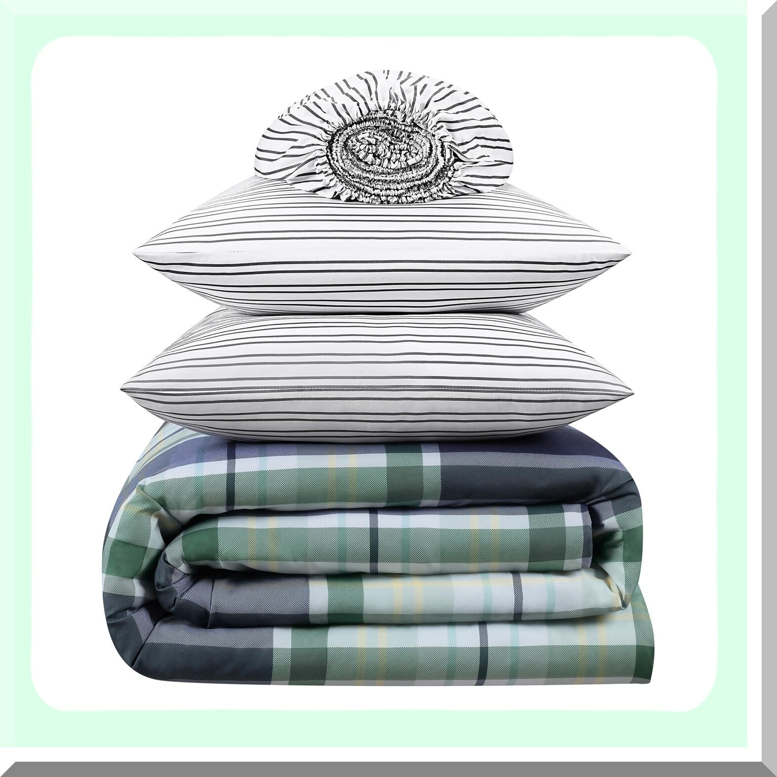 Plaid Comfort Queen Bedding Set - Soft & Cozy 7-Piece Complete Bed in A Bag with Sheets & Pillowcase for All Seasons - Simply Clean Design