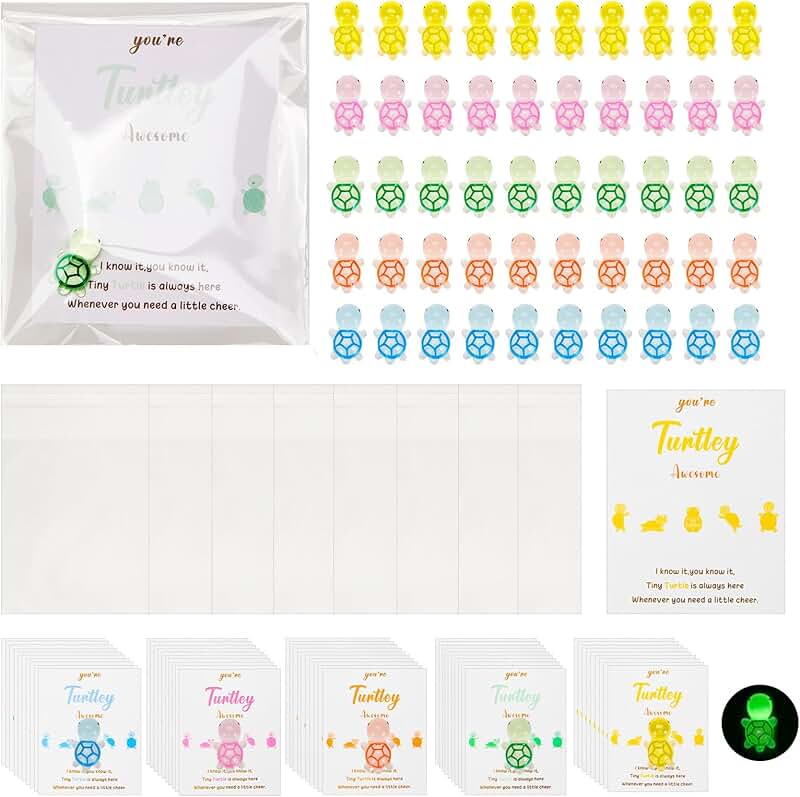This set includes 50 glow-in-the-dark turtle figurines, each accompanied by a greeting card. These small, decorative turtles are designed to shine in the dark, making them a fun and unique way to show appreciation. They are suitable for recognizing staff, volunteers, teachers, or anyone deserving of a thoughtful gift. The set offers a simple and meaningful way to express gratitude and encouragement.