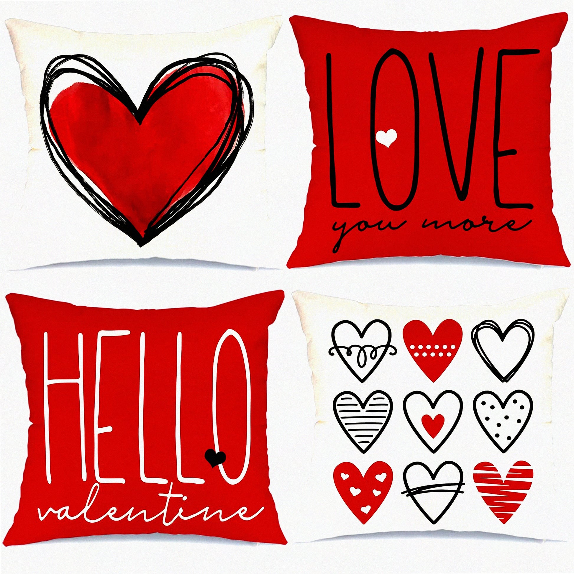 Love Heart Pillow Set - 18x18 Decorative Throw Pillows for Valentines Day Decorations - Set of 4 Red Love You More Pillow Covers