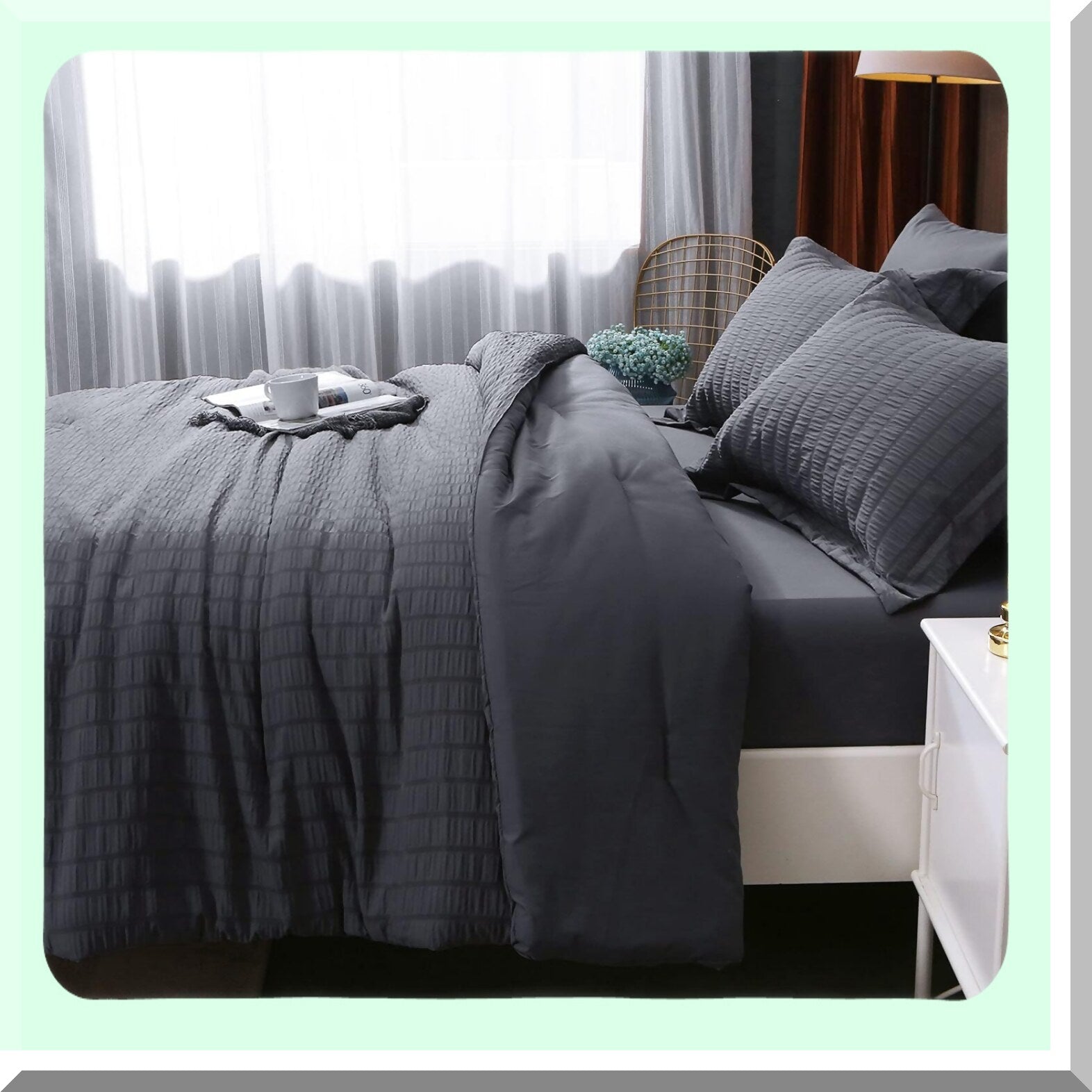 Luxury Seersucker Comforter Set - 7 Piece Bedding Bundle for Bedroom - All Season Bed in a Bag - Dark Grey Sheets, Pillowcases, Shams - Size Comforter