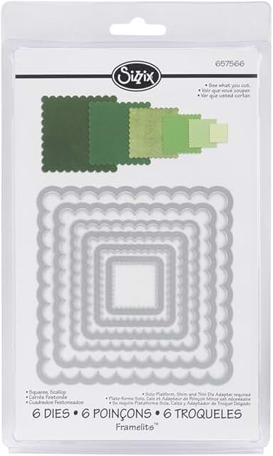 This set includes six metal dies designed for cutting shapes from paper and other thin materials. The set features square and scalloped square designs, allowing for versatile crafting projects. Each die is precisely cut to create clean, detailed edges, making it easy to add decorative elements to cards, scrapbooks, and other paper crafts. The dies are compatible with most die-cutting machines, providing a simple way to enhance your creative projects with professional-looking shapes.