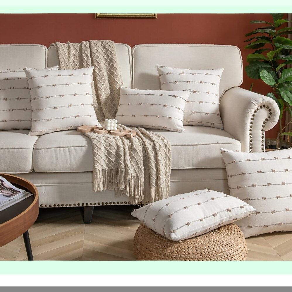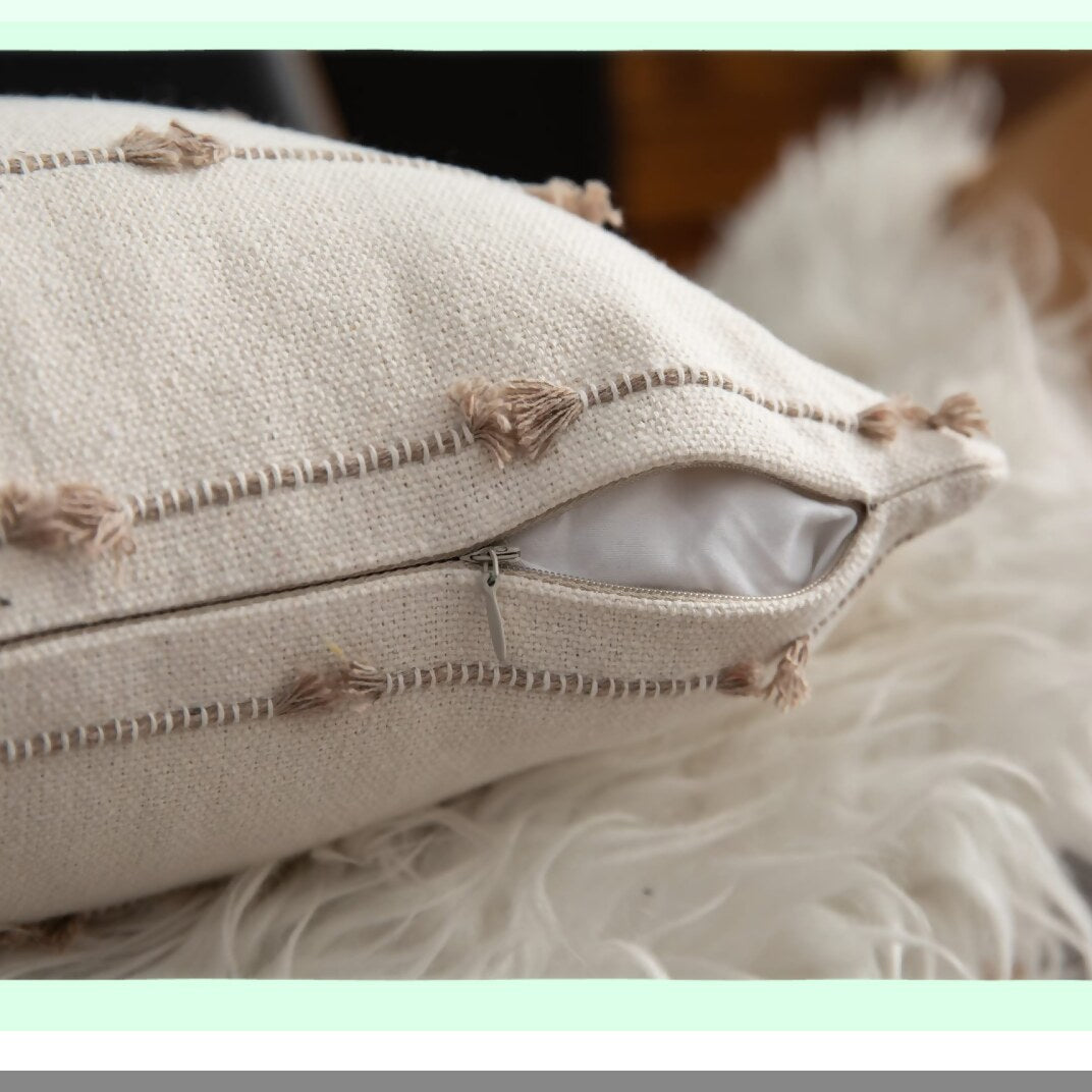 The throw pillow covers feature an exquisite chic design with a natural and comfortable color, adding cuteness with mini tassels. The double-sided design is versatile and aligns well with various decor styles. The invisible zipper is durable and practical, making it easy to dress up furniture. The multi-usage of the pillow covers allows for indoor and outdoor use in various settings such as living rooms, bedrooms, offices, and more.