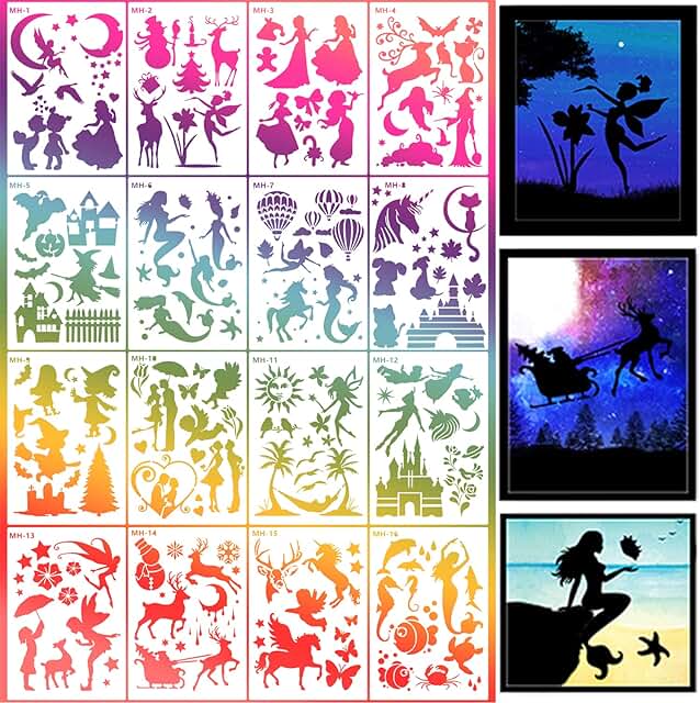 This set includes 16 reusable stencils designed for painting on wood. They feature various fantasy-themed silhouettes suitable for DIY crafts and scrapbooking projects. Made from durable material, these templates can be used multiple times to create detailed and consistent designs. Ideal for adding decorative elements to your creative projects, they are easy to clean and store. Perfect for artists and hobbyists looking to enhance their artwork with intricate fantasy motifs.