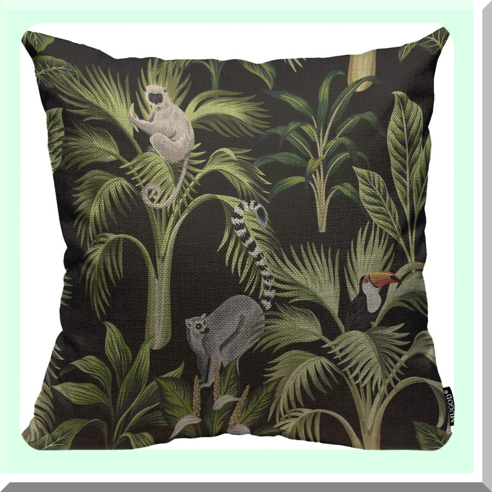 Tropical Paradise Decorative Pillow Cover - Palm Trees, Lemur, Sloth, Toucan & Bird Square Cushion Case for Home Bedroom Living Room - 18x18 Inch Floral Throw Pillow