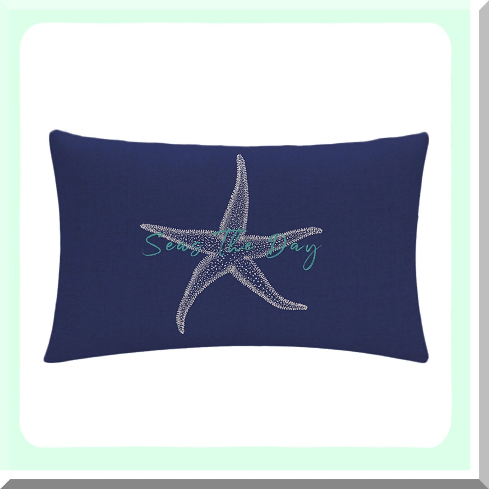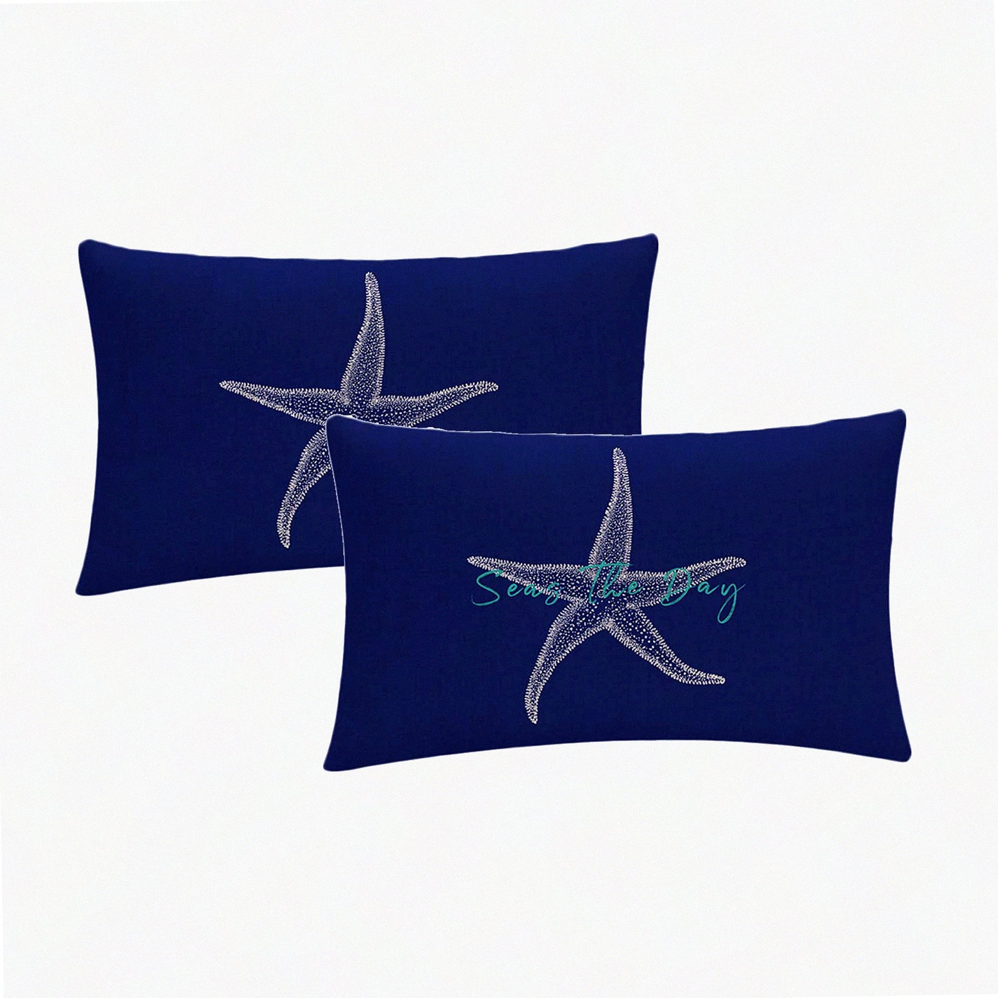 Starfish Shoreline Throw Pillow Cover - Coastal Sea Theme Decorative Cushion Set - Navy Blue Beach House Pillowcases - 12" x 20" Rectangular/Waist