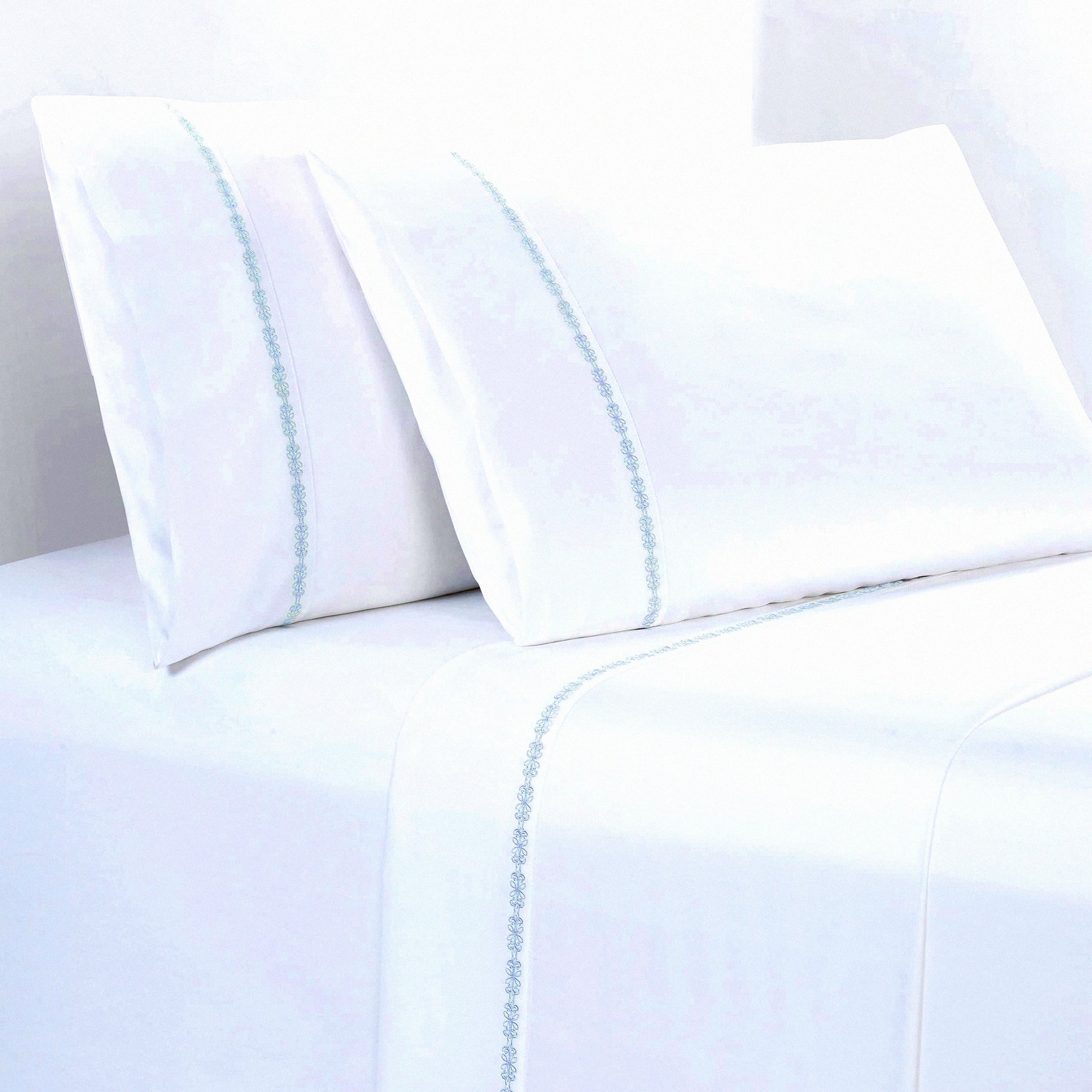 Luxury Laurel 350 Thread Count Hotel Style Cotton Sheet Set - Full Size White with Light Blue Embroidery - 4 Piece Bedding Bundle - Soft & Breathable - Includes Flat Sheet, Fitted Sheet, 2 Pillowcase