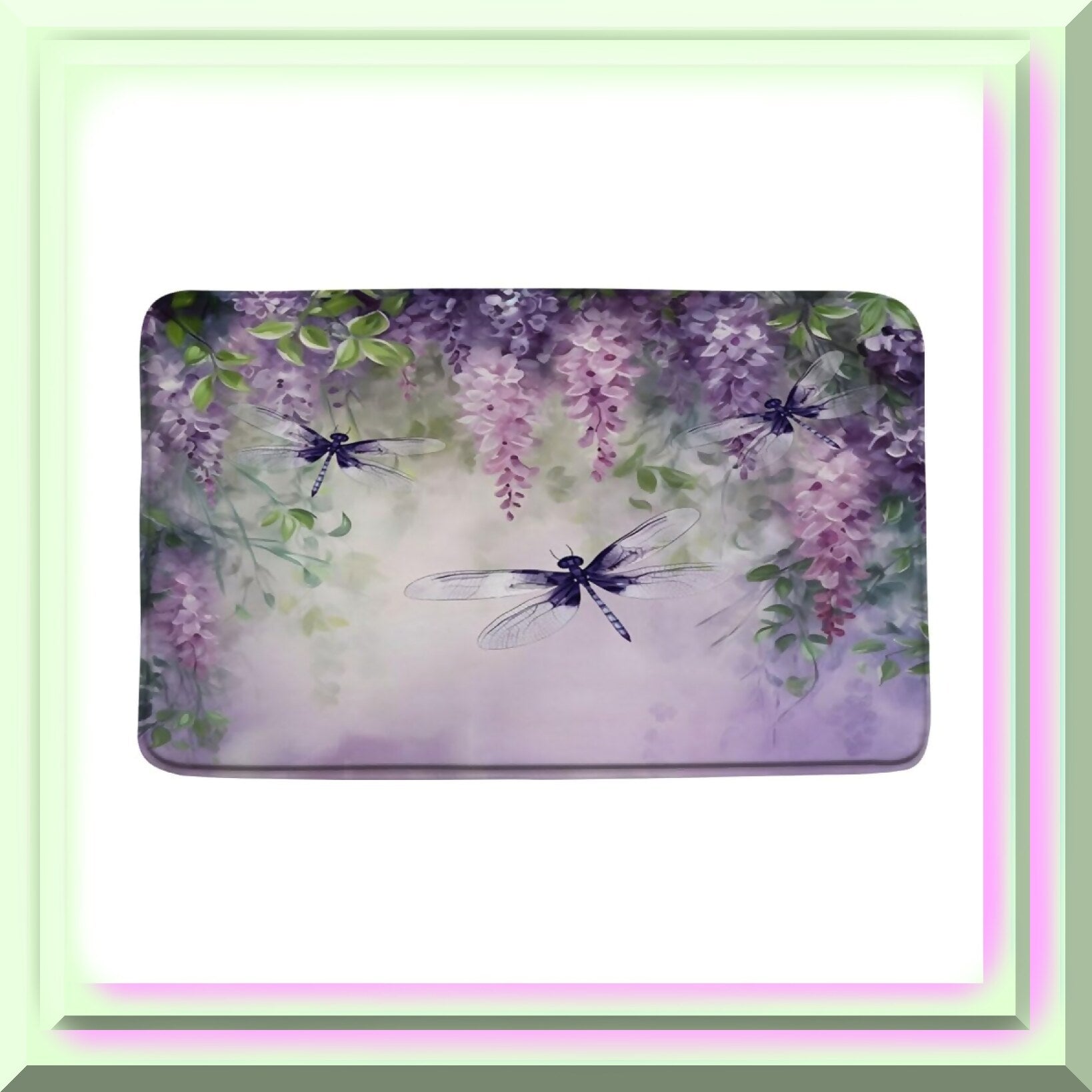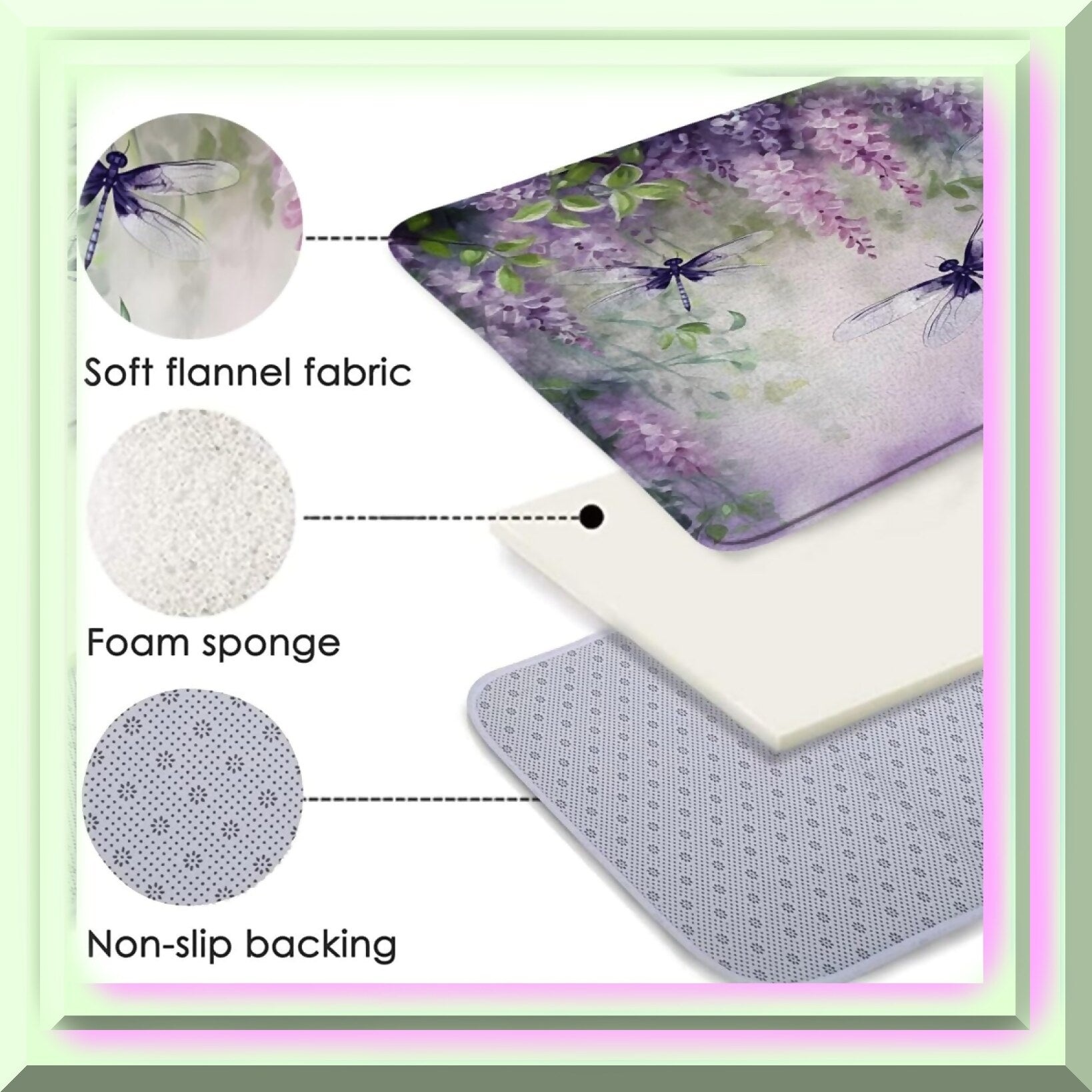 This bath mat features a beautiful watercolor design of purple dragonflies, flowers, wisteria, animals, rustic violet leaves, and wildlife elements, creating a vibrant and nature-inspired look. Made from soft memory foam, it provides a warm and comfortable feel underfoot, adding a cozy touch to your bathroom or kitchen. The mat measures 17.8 inches by 29.5 inches, making it a versatile addition to various spaces. Its easy-care design allows for machine washing in cold water and low-temperature drying, ensuring convenience and durability. The colorful floral and wildlife motifs can refresh your roomβs appearance, bringing a new, lively atmosphere to your home. Please note that slight color variations may occur due to monitor differences, and manual measurements may have a 1-2 cm error margin. For any questions, customer support is available to assist within 24 hours.