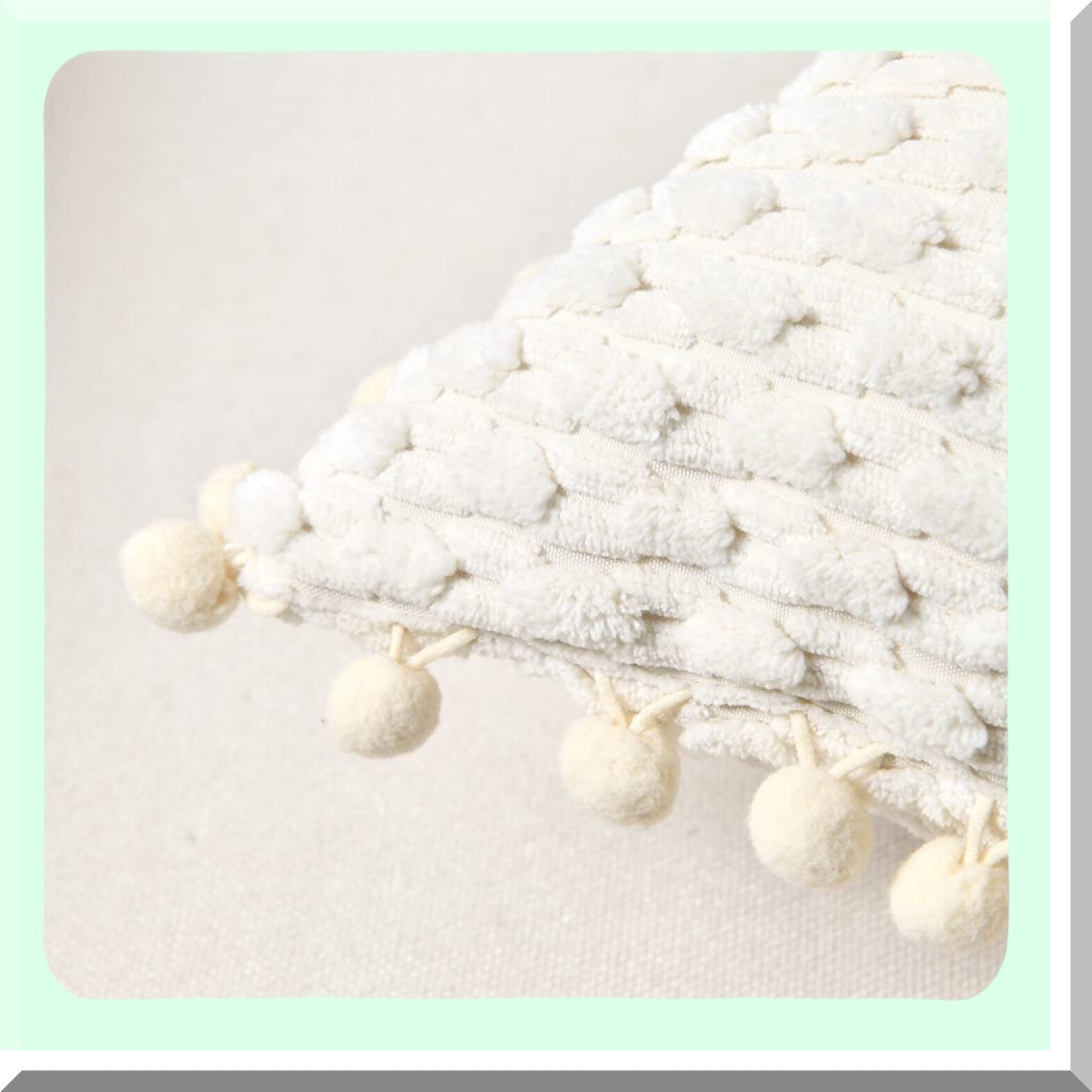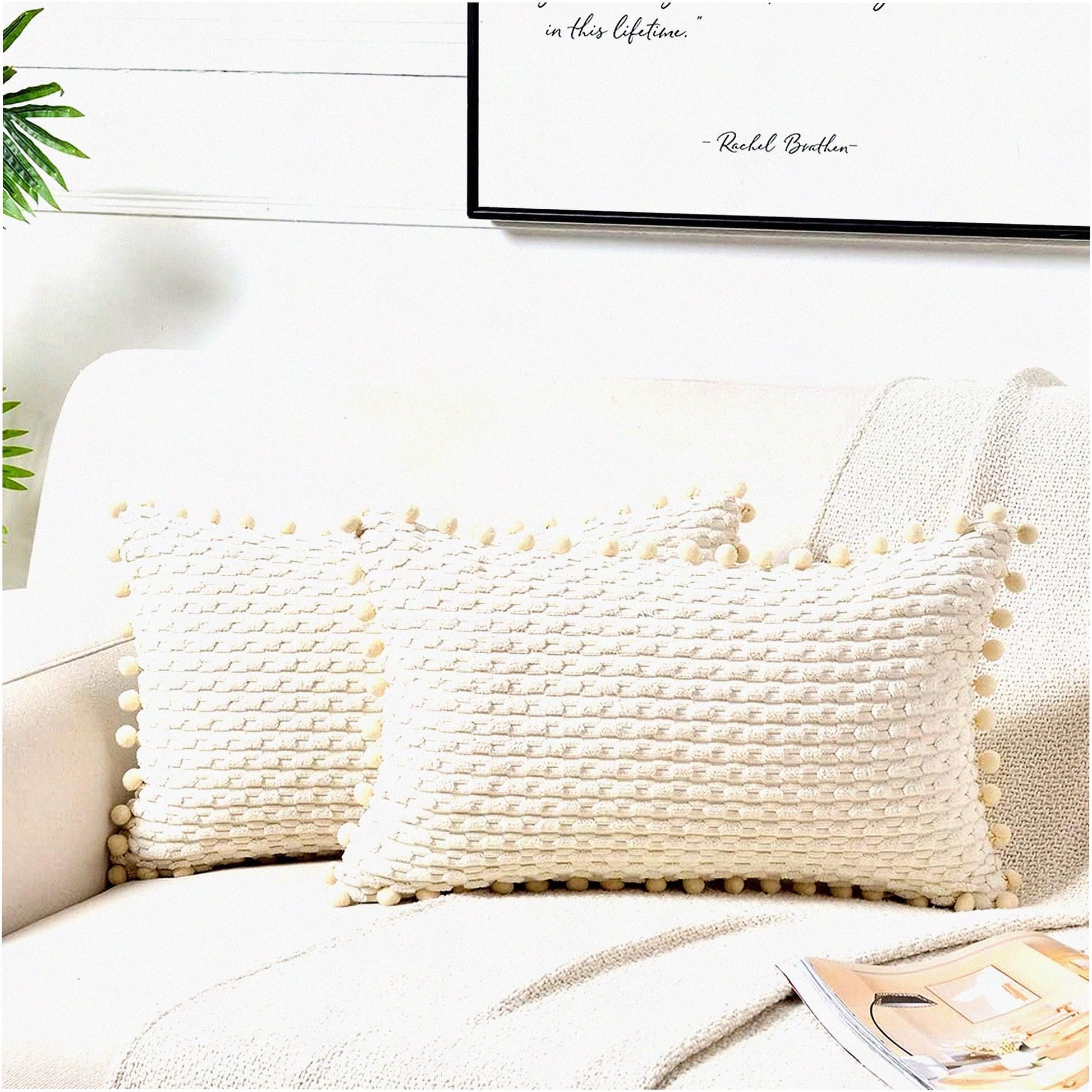 Cream Pom-Pom Lumbar Pillow Set - Modern Farmhouse Decorative Throw Covers for Couch & Bed - Soft Plush Corduroy Rectangle Cushion Case - 12x20 Inch - Boho Home Decor - Sofa Accent - 30x50 cm
