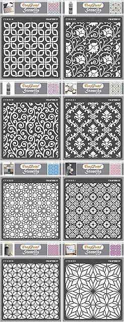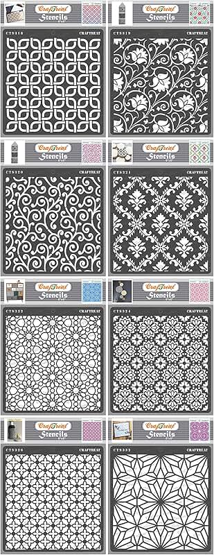 This set includes 2 to 8 reusable stencils, each measuring 6x6 inches, designed for various craft projects. They can be used to create background patterns on wood, walls, tiles, canvas, paper, fabric, and floors. The stencils are suitable for painting, decorating, and DIY art projects, offering a variety of background designs. Made from durable material, they can be cleaned and reused multiple times. These stencils are ideal for adding decorative touches to different surfaces and enhancing creative projects with detailed patterns.