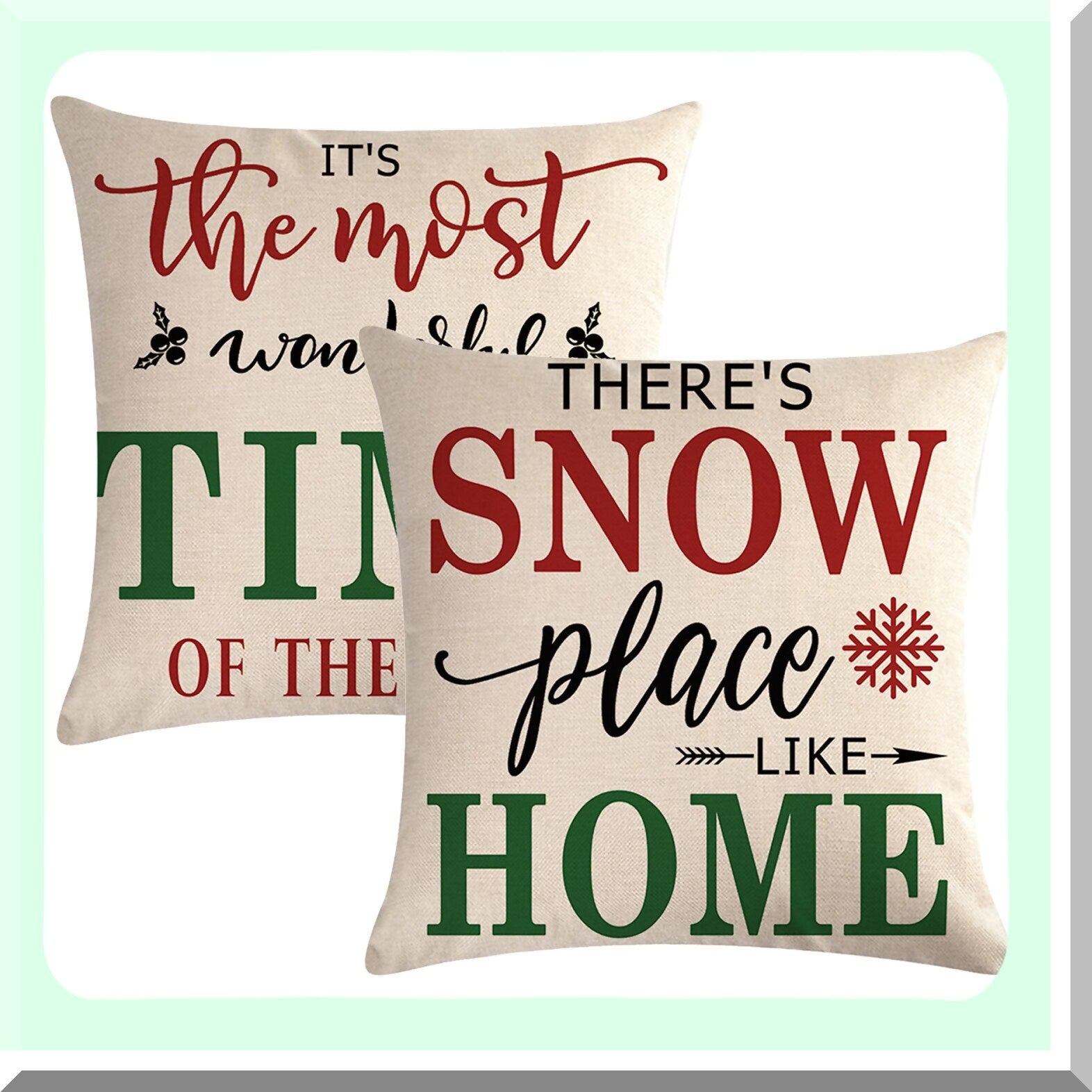 Winter Wonderland Holiday Pillow Covers - Set of 2 Festive Red & Green Throw Pillowcases with Merry Saying "It's The Most Wonderful Time of The Year" - Farmhouse Decor Cushion Covers 20" x 20"
