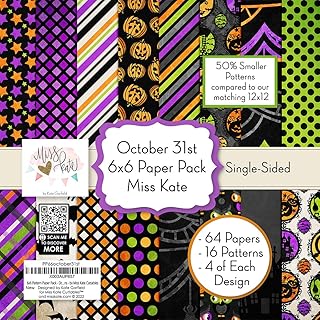 This collection features 64 single-sided 6x6-inch pattern papers with Halloween-themed designs. The patterns are smaller in size, making them suitable for various craft projects. The papers are designed for scrapbooking and other creative uses, offering a variety of festive motifs.