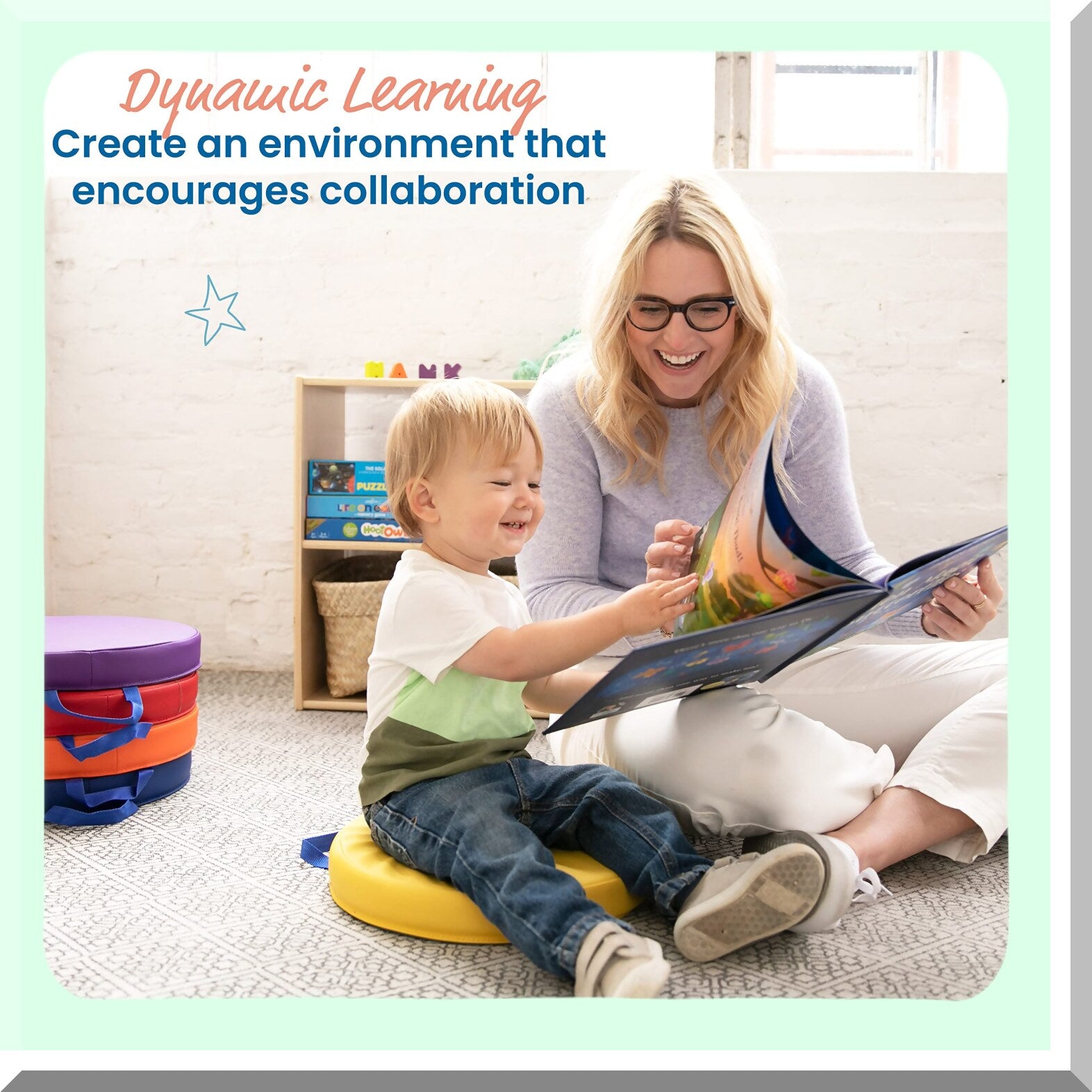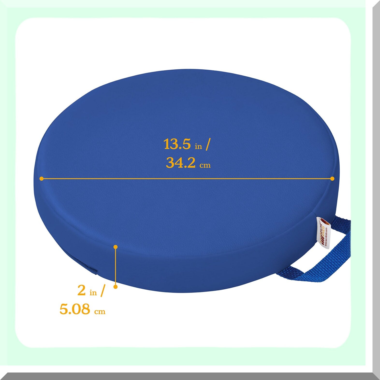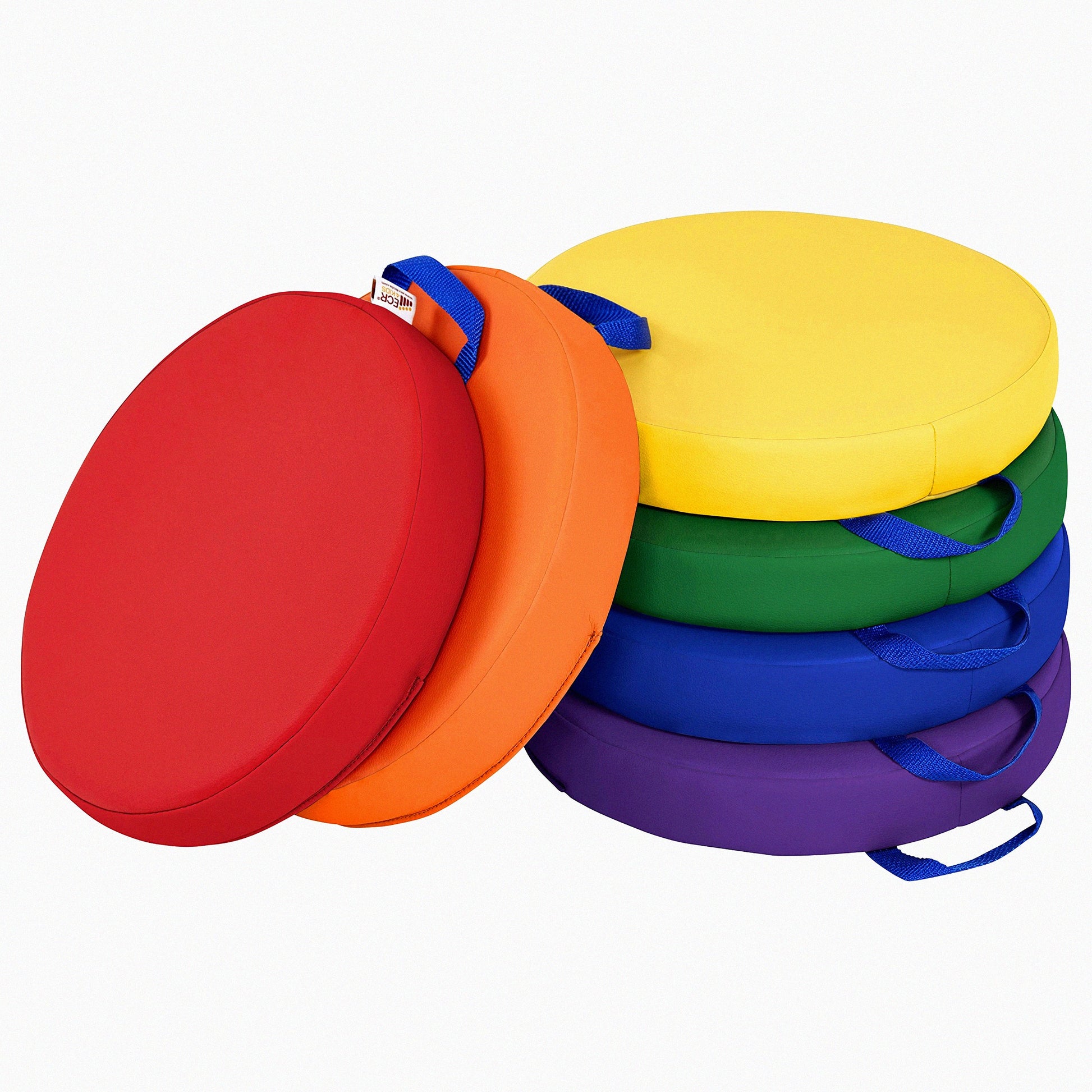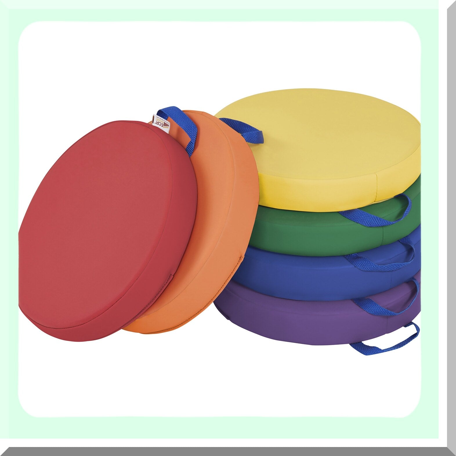 Round floor cushions offer practical benefits for flexible learning environments in schools, early childhood settings, or at home. These cushions are made of thick, comfortable foam, providing personal space for learners to sit or kneel during activities like circle time or at floor tables. They encourage collaboration by allowing the creation of seating pods or reading circles. The built-in carry handle enables children to independently move the cushions to their preferred spots for relaxing, reading, snacking, or playing games. Safety is ensured as the cushions are latex-free, GREENGUARD certified for low VOCs, CPSIA compliant, and meet CAL TB 117 requirements, constructed with CertiPUR-US foam. Each cushion measures 13 inches in diameter.