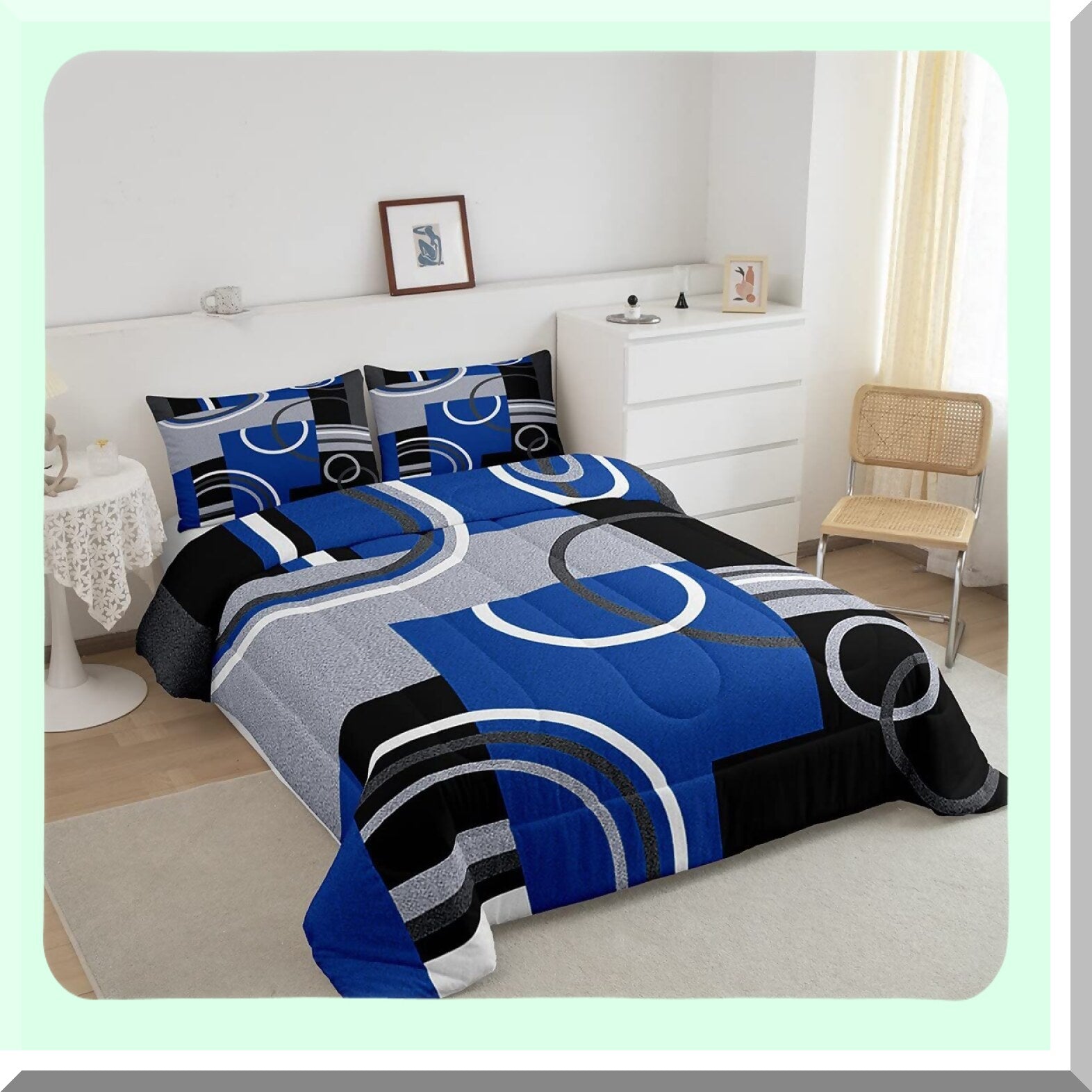 Geometric Swirls Comforter Set - Modern Abstract Bedding Collection with Graphic Artwork Quilt - Royal Blue Black Grey Queen Size - All Season Bedroom Decor