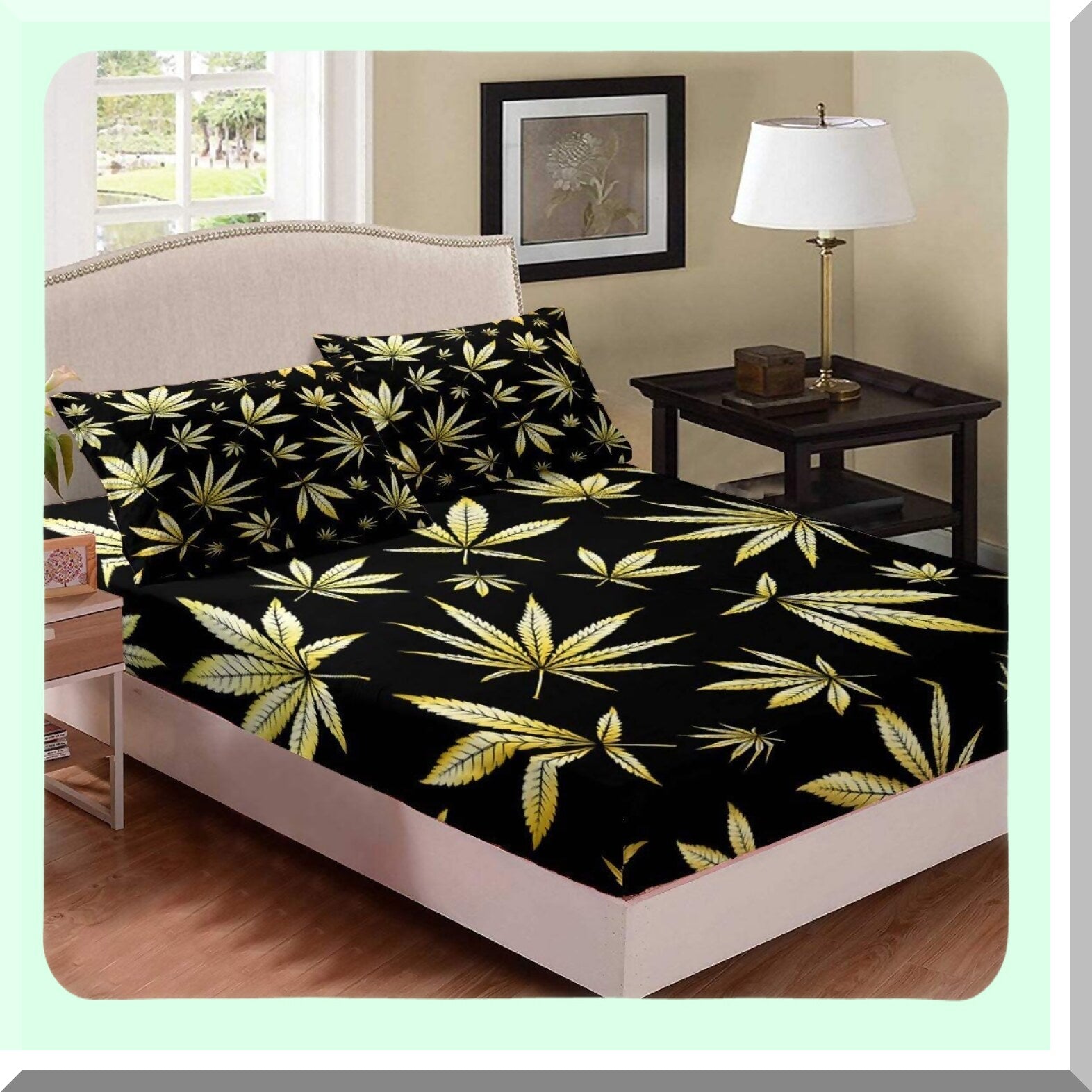 Trippy Leaves Bohemian Bedding Set - Yellow Marijuana Sheet Set with Deep Pocket - 4 Piece Plant Inspired Sheet Set - Black Fitted & Flat Sheet