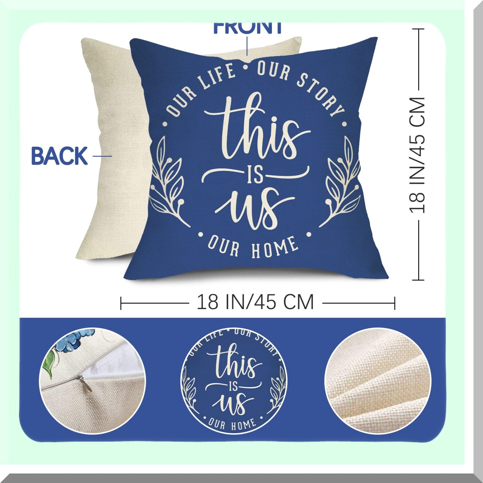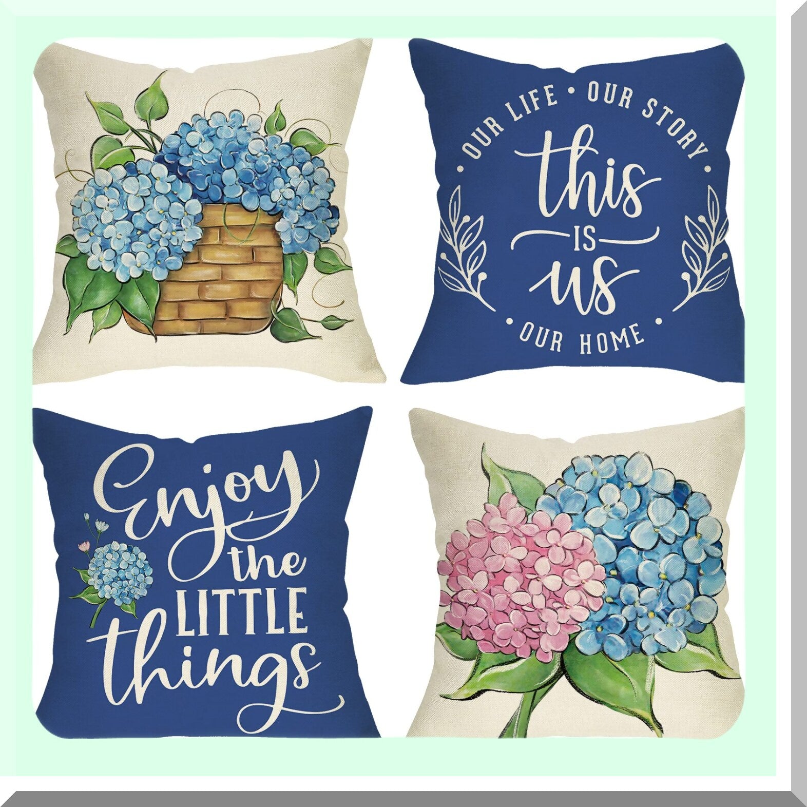These 4 PCS 18 x 18 inches decorative pillow covers feature a single-sided print with blue hydrangea. Practical benefits include enhancing home decor with a stylish and elegant design, easy updating of room aesthetics, and providing a fresh, seasonal look. The covers are likely easy to remove and clean, making maintenance simple. Their size fits standard pillows, ensuring compatibility and convenience for users.