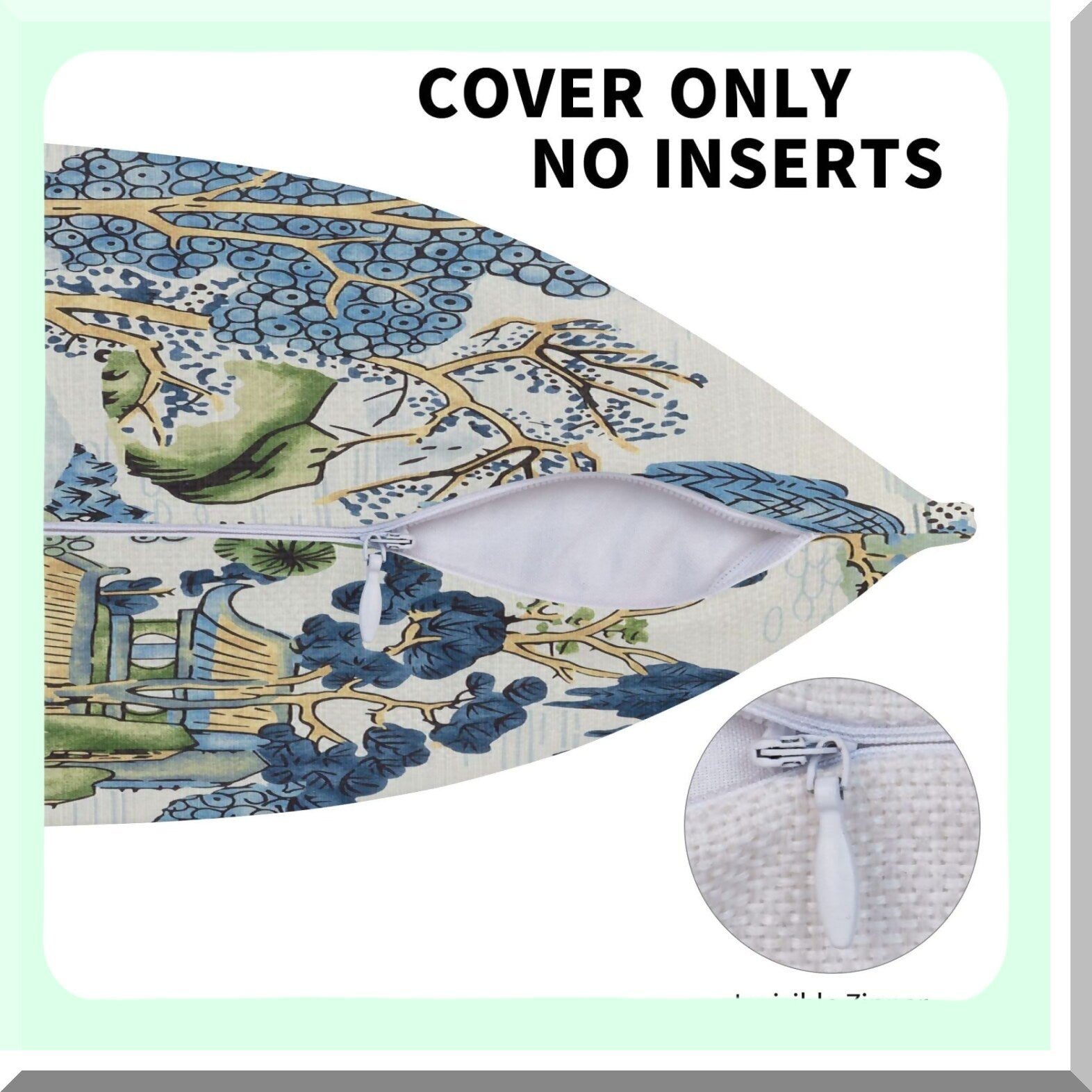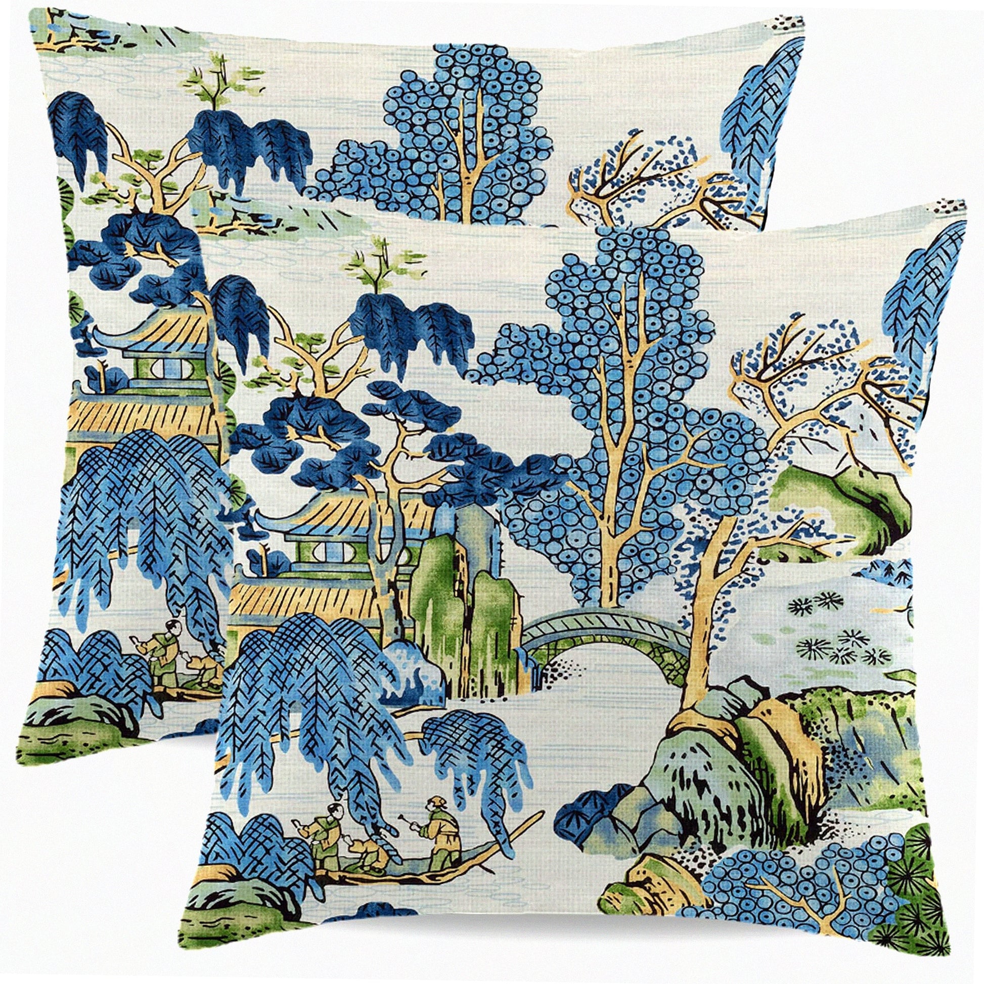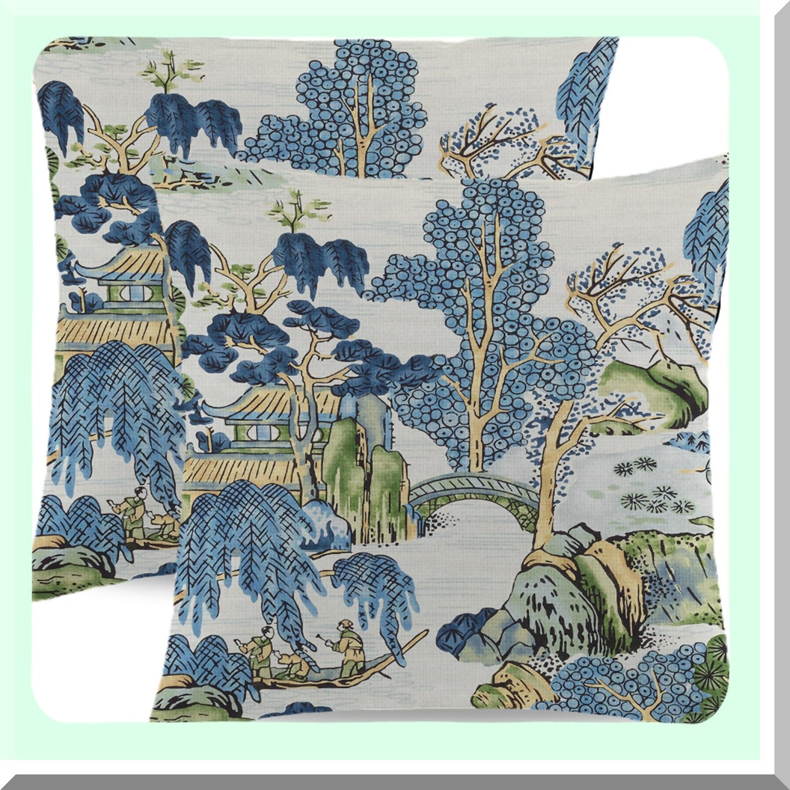 Scenic Chinoiserie Pillow Set - Blue & Green 24x24 Inch Farmhouse Decor Cushion Cover for Sofa & Bedroom - Asian Throw Pillows Outdoor
