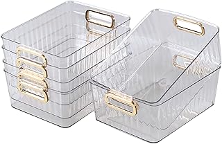 These clear plastic organizing bins are designed for pantry and fridge storage. They come in a set of six, providing a practical solution for keeping food and small items neatly arranged. The transparent design allows for easy identification of contents, making it simple to find what you need quickly. The sturdy plastic construction ensures durability and long-lasting use. Ideal for organizing shelves, cabinets, or drawers, these baskets help maximize space and maintain a tidy environment. Their versatile size makes them suitable for various storage needs around the home.