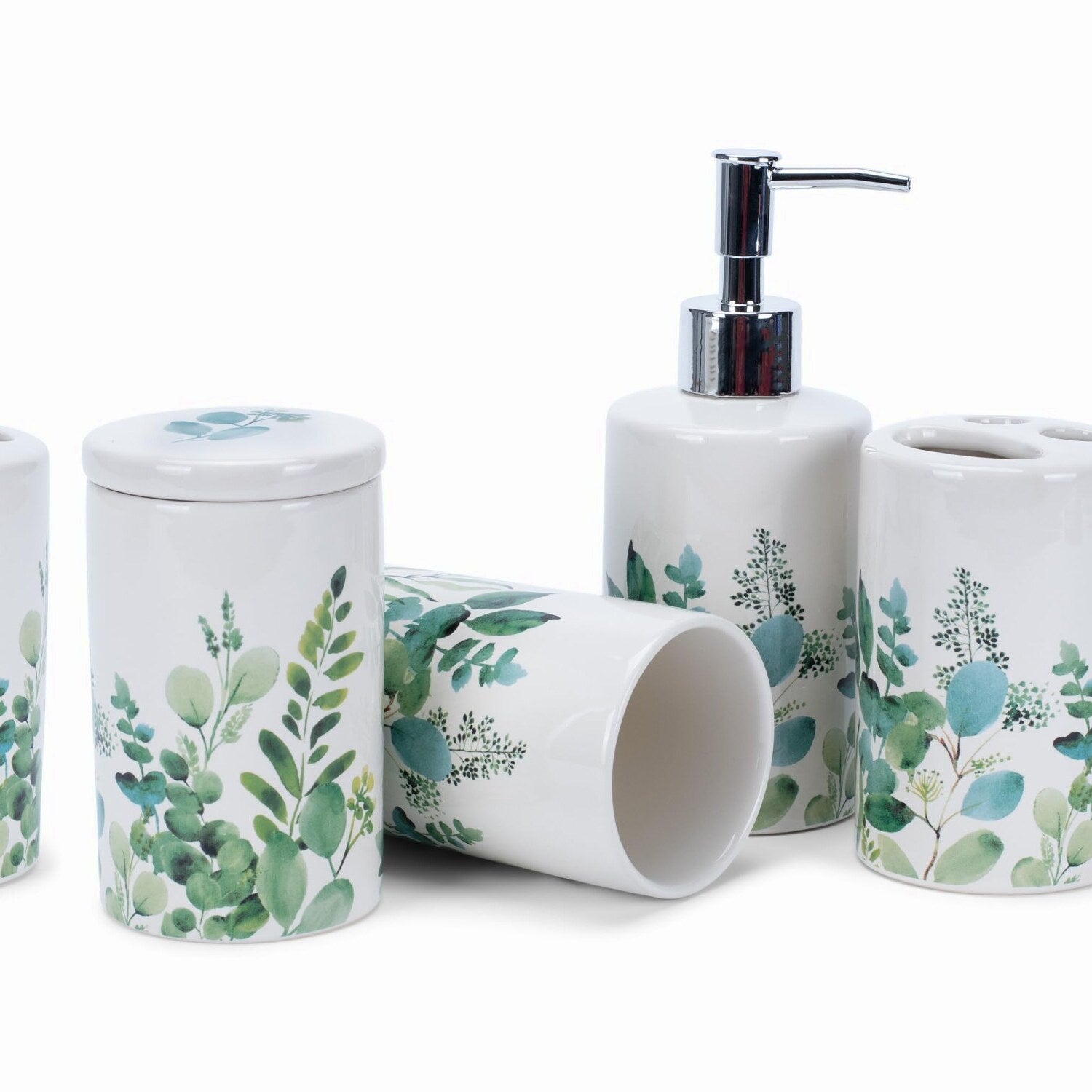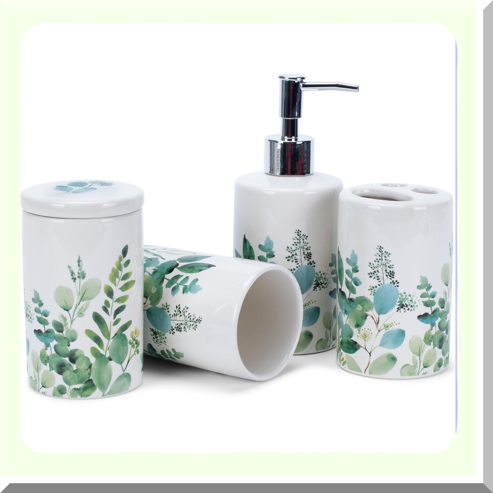 This set includes four matching ceramic accessories designed to enhance your bathroom or kitchen space. The collection features a soap dispenser, a toothbrush holder with three holes, an open canister, and a storage canister with a lid. Each piece showcases a modern rounded design with a floral greenery on cream white finish, adding a stylish touch to your household decor. Crafted from ceramic, these accessories combine functionality with aesthetic appeal, making organization effortless and attractive. Perfect for everyday use, they help keep your essentials neatly arranged while elevating the look of your space. Whether for personal grooming or kitchen organization, this set offers a cohesive and elegant solution. The neutral color palette and contemporary design make it suitable for various interior styles, providing both practicality and decorative charm. Ideal for those seeking a simple yet sophisticated way to organize and decorate their home.