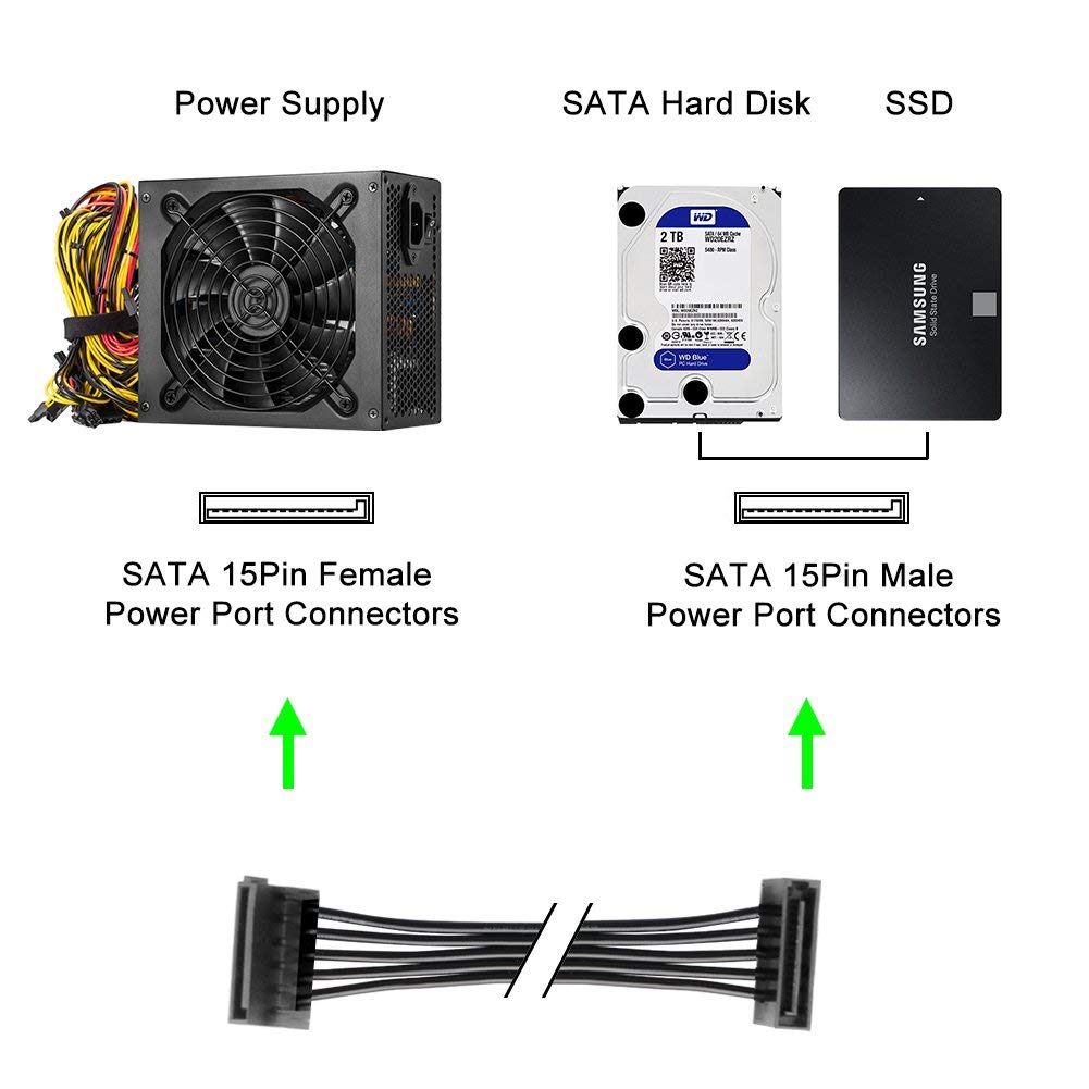 Description Our SATA power splitter cable (1 to 4) breaks out a 15 Pin SATA male power connector into four 15 Pin SATA female power connectors, and overcomes the limit of the number of SATA devices, such as SATA HDD, Disk drive, SSD or SATA optical drives that can be installed in the system. Come with 2 packs. The cable eliminates the cost of having to upgrade the power supply to accommodate additional SATA drives and is easy to use and install. 20 inches cable harness holds 5 SATA connectors (each connector is 4 inches apart), providing sufficient space for internal cable management. Designed with PVC flexible jacket, 18 AWG oxygen free copper and bare copper braided shielding prolongs the life span of this cable as well as ensures a safe connection between power supply and SATA devices. Lock connector design is adopted to prevent accidental disconnections. Warranty: 1-Year Limited Warranty.