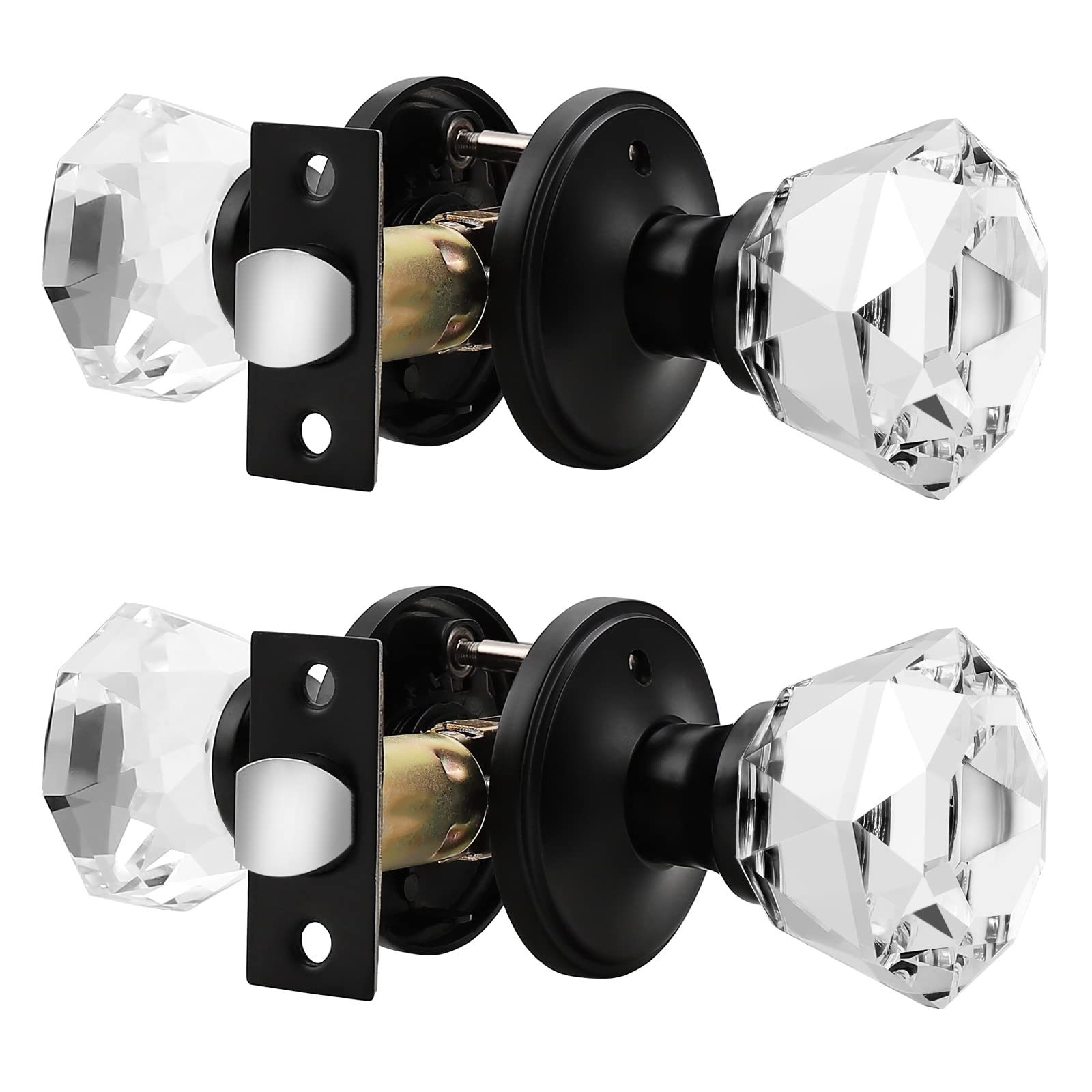 2 Pack Crystal Privacy Door Knobs for Bed/Bath Room, Keyless In or Door Handles with Lock, Faceted Diamond Shape Gl with Zinc Alloy Black Rosette
