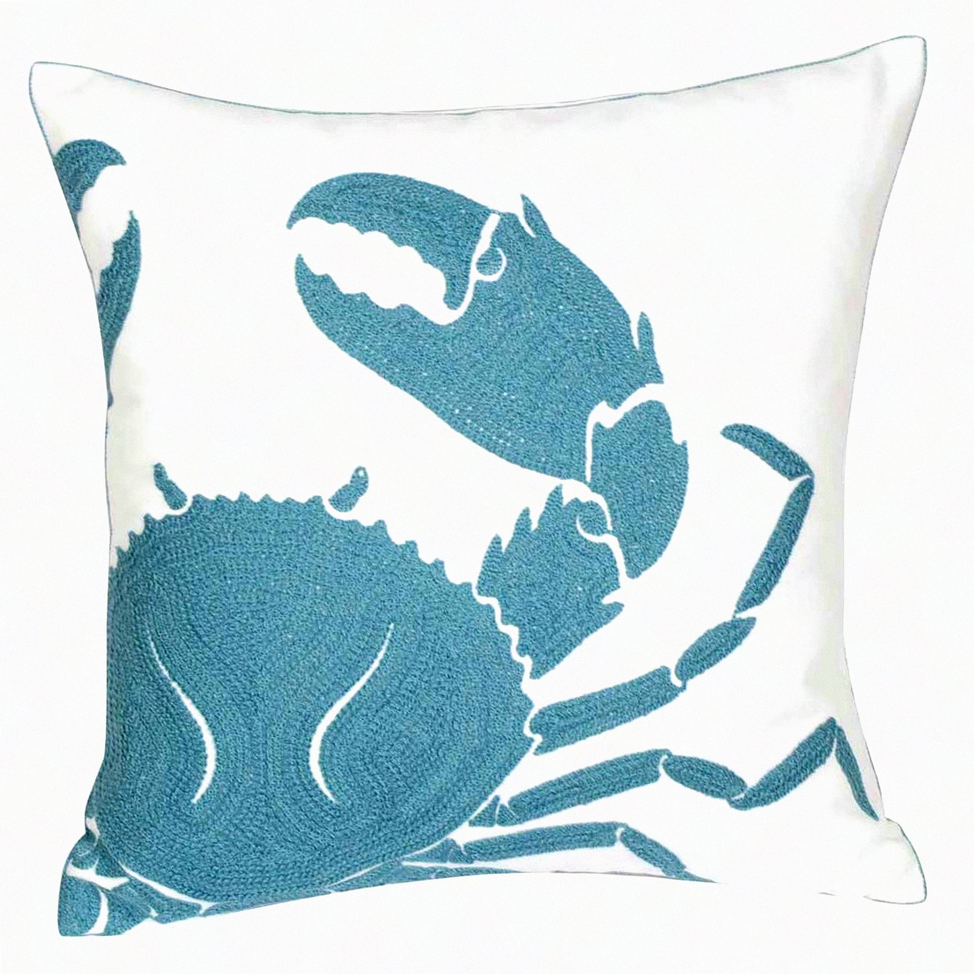 Nautical Embroidered Seafoam Pillow Cover - Coastal Decorative Canvas Cushion Case for Beach House Style - Crab Design - 18 Inch Square