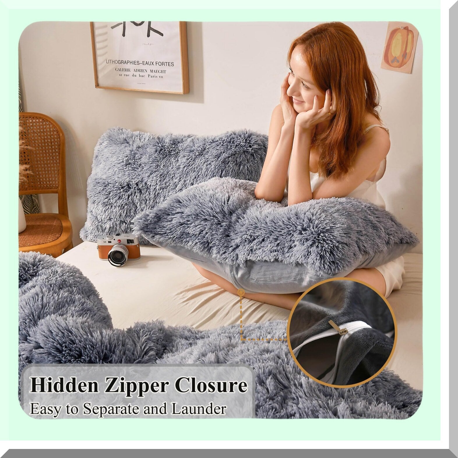Ultra Plush Shaggy Pillowcase Set - Fluffy Crystal Velvet Decorative Covers with Furry Fuzzy Shams, Zipper Closure - Soft Gray Ombre Throw Pillow Cases (Set of 2)