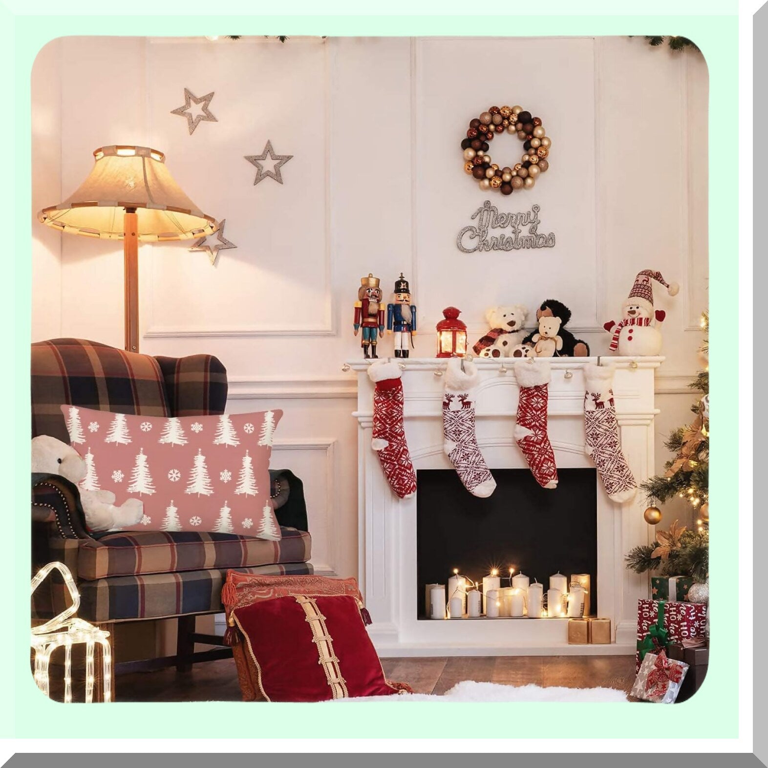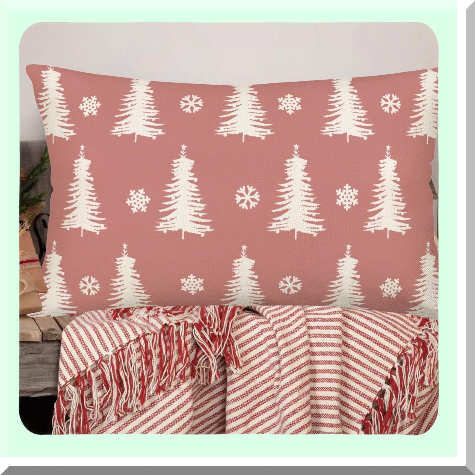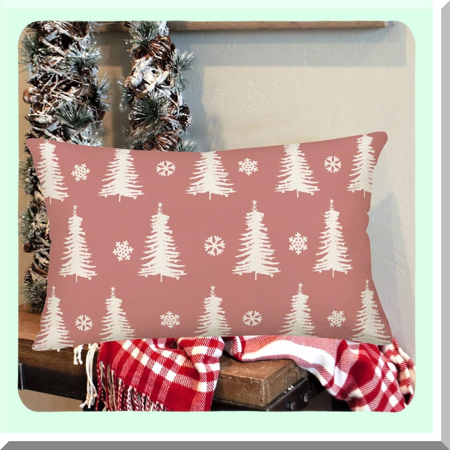 Winter Wonderland Lumbar Pillow Cover - Farmhouse Decorative Tree Snowflake Cushion Case for Sofa Couch, 12x20 Inch Pink White Home Decor