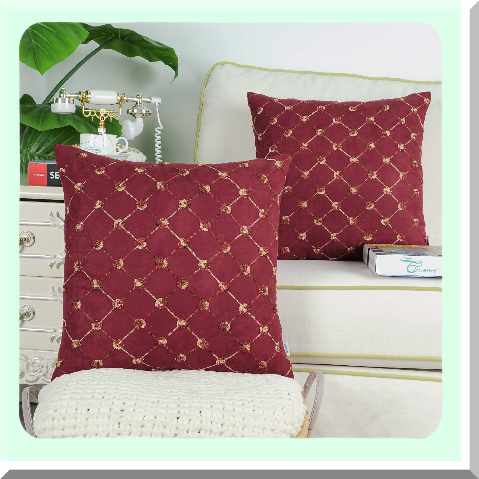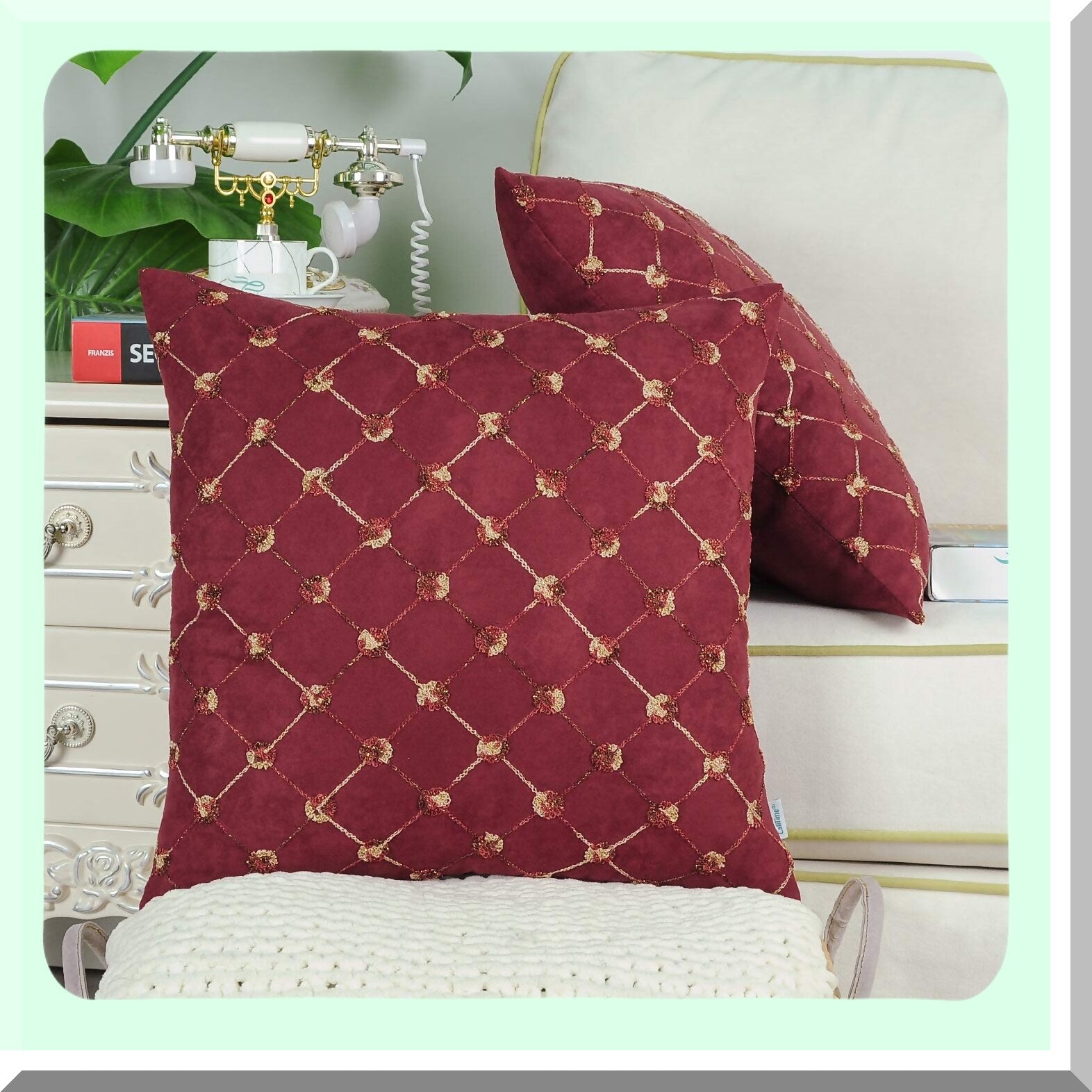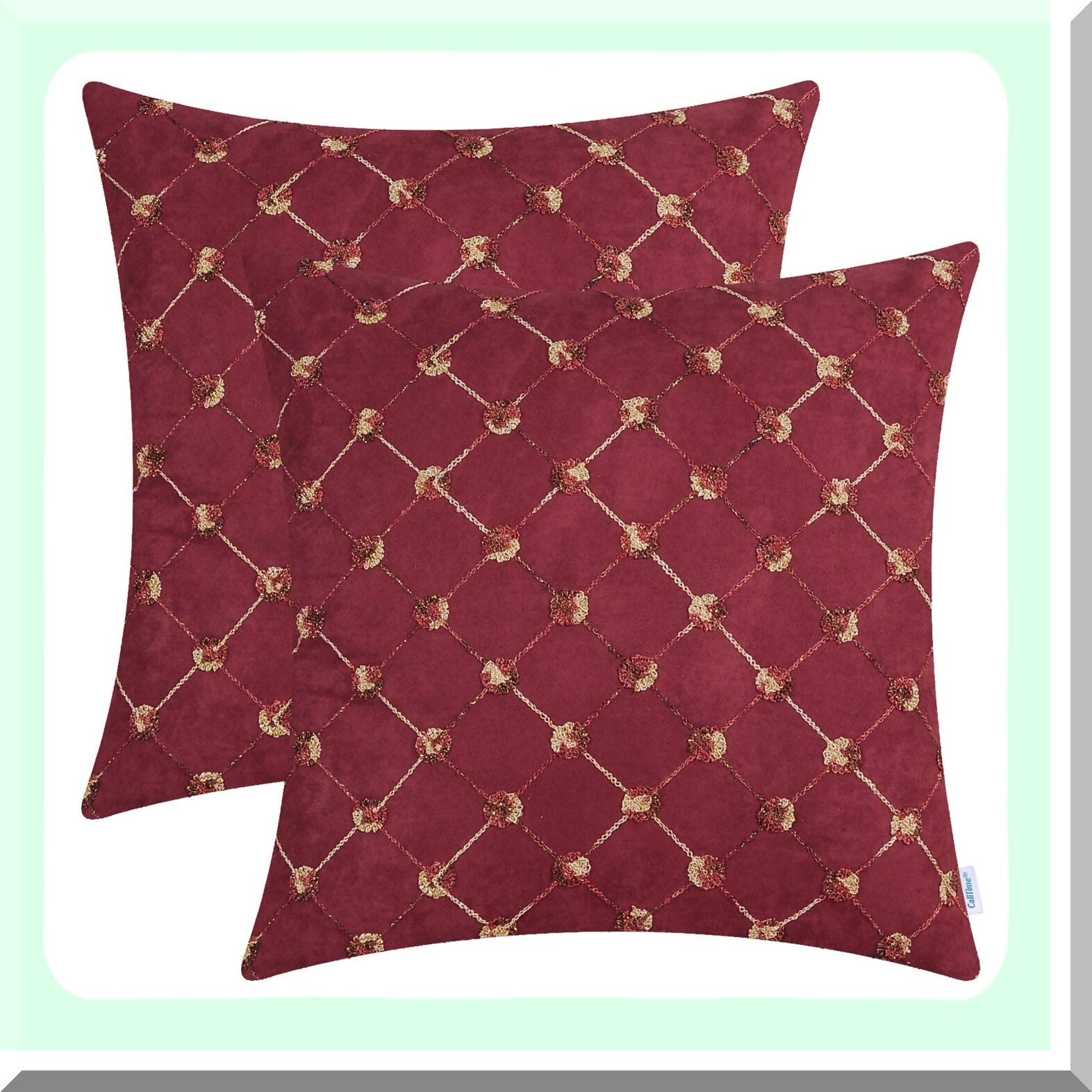 Diamond Chain Embroidered Throw Pillow Covers - Set of 2 | Modern Geometric Sofa Decor Cases | Supersoft 18 X 18 Inches Dark Red Trellis Shape