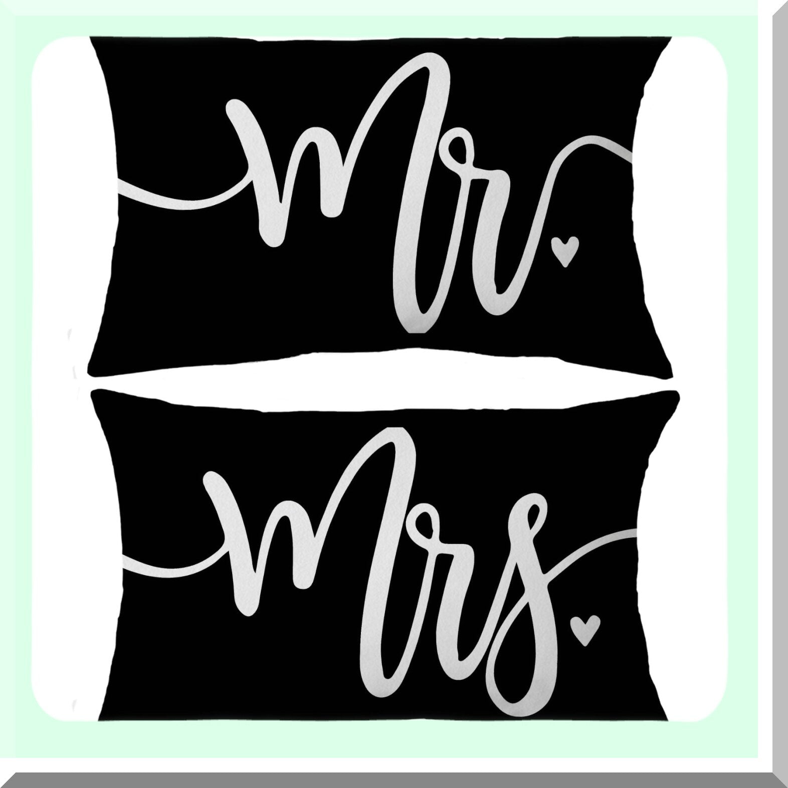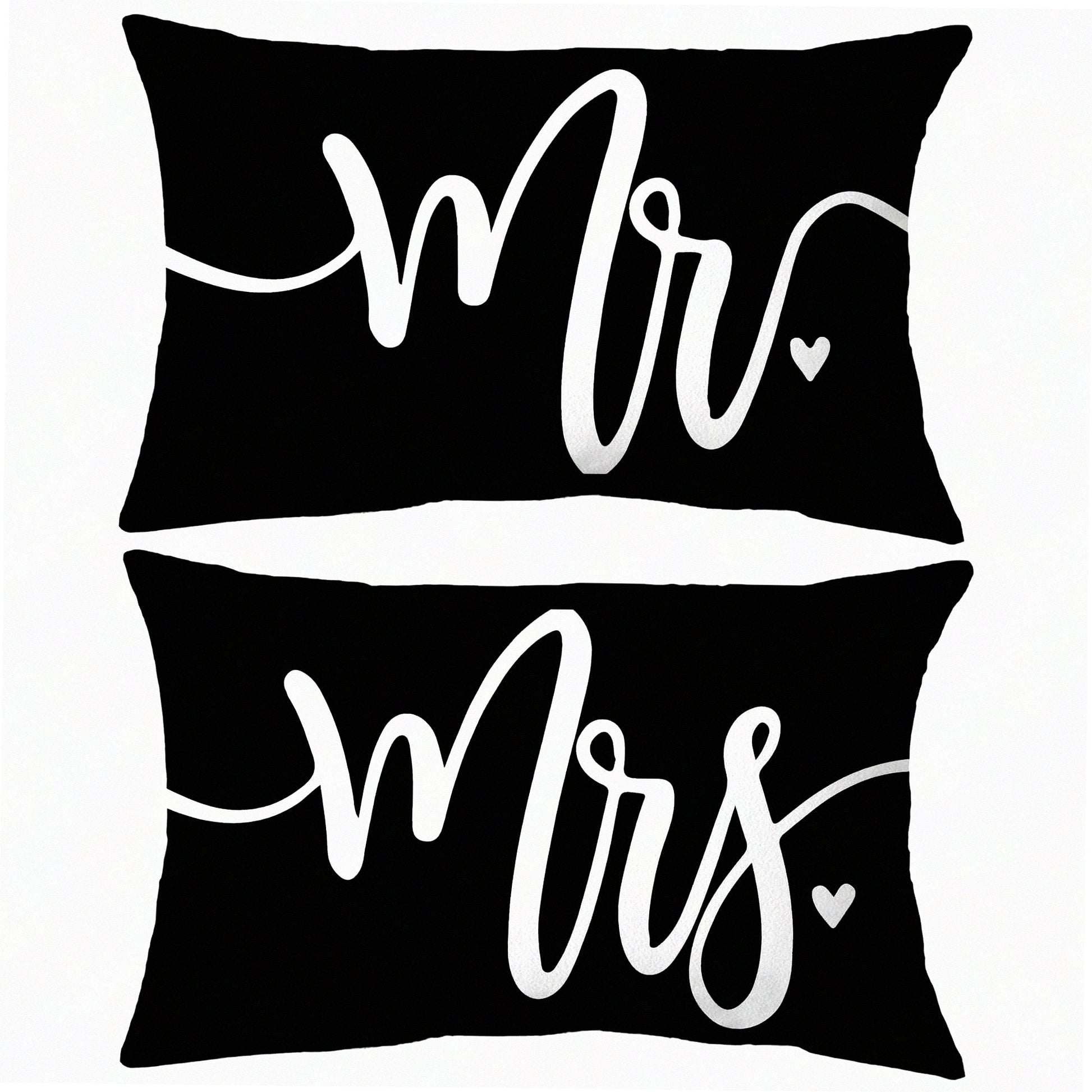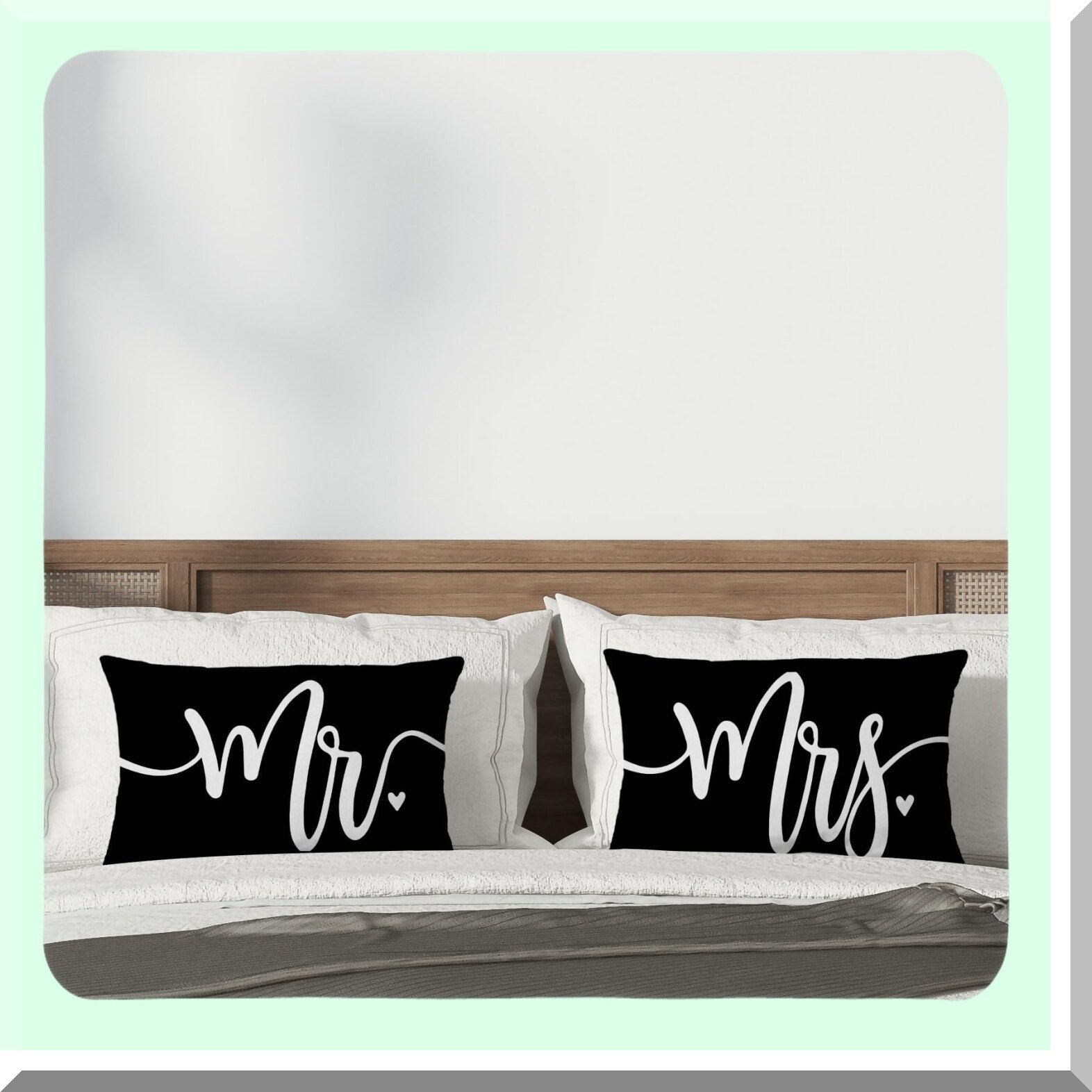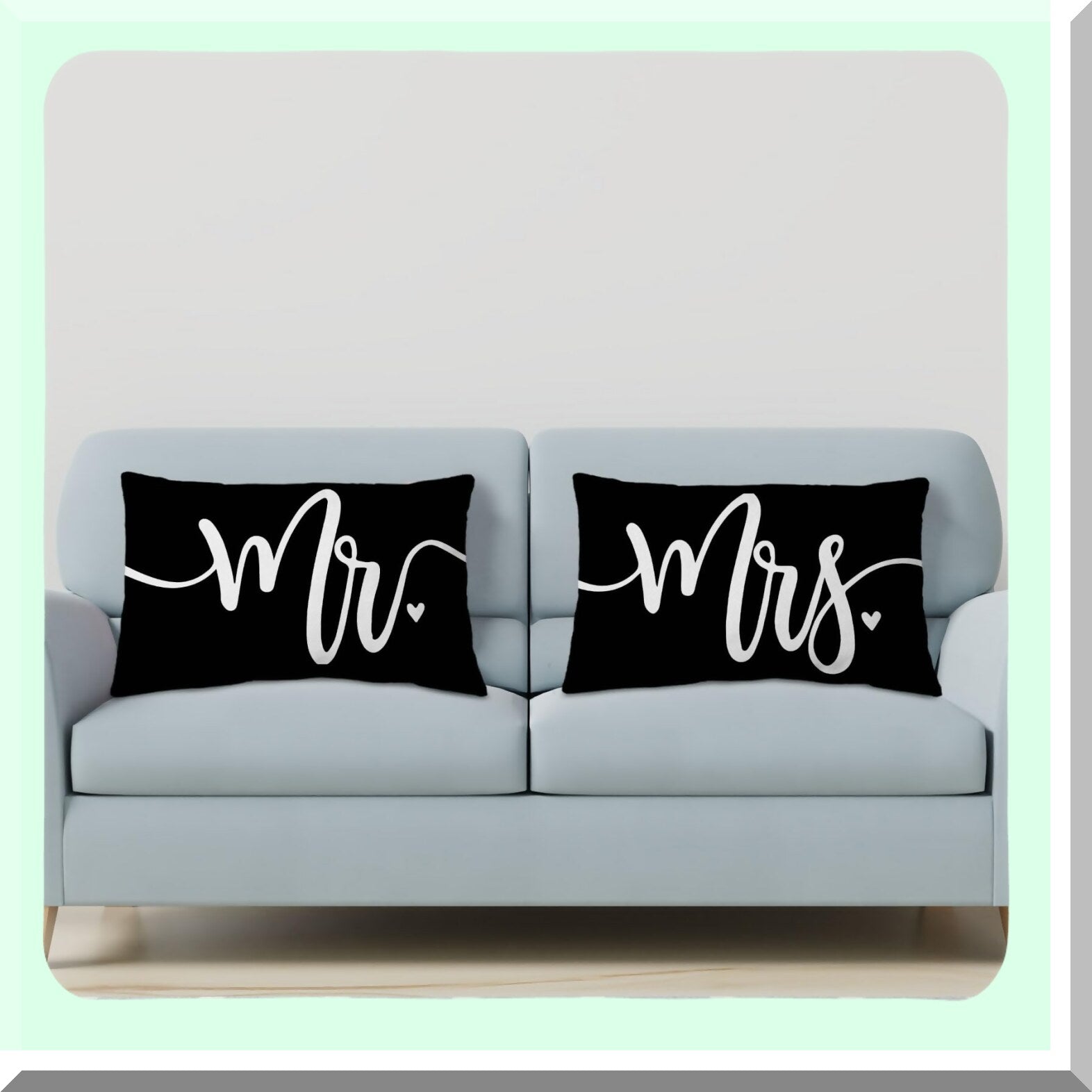 The Mrs. and Mr. Throw Pillow Case Set of 2, sized 12 x 20 inches, offers practical benefits as home decor and a thoughtful gift. These black cushion covers are ideal for adding a stylish touch to any living space. They serve as a unique and humorous gift for couples, making them perfect for weddings or anniversaries. The set enhances home aesthetics while providing a personalized touch that celebrates the couple's relationship.