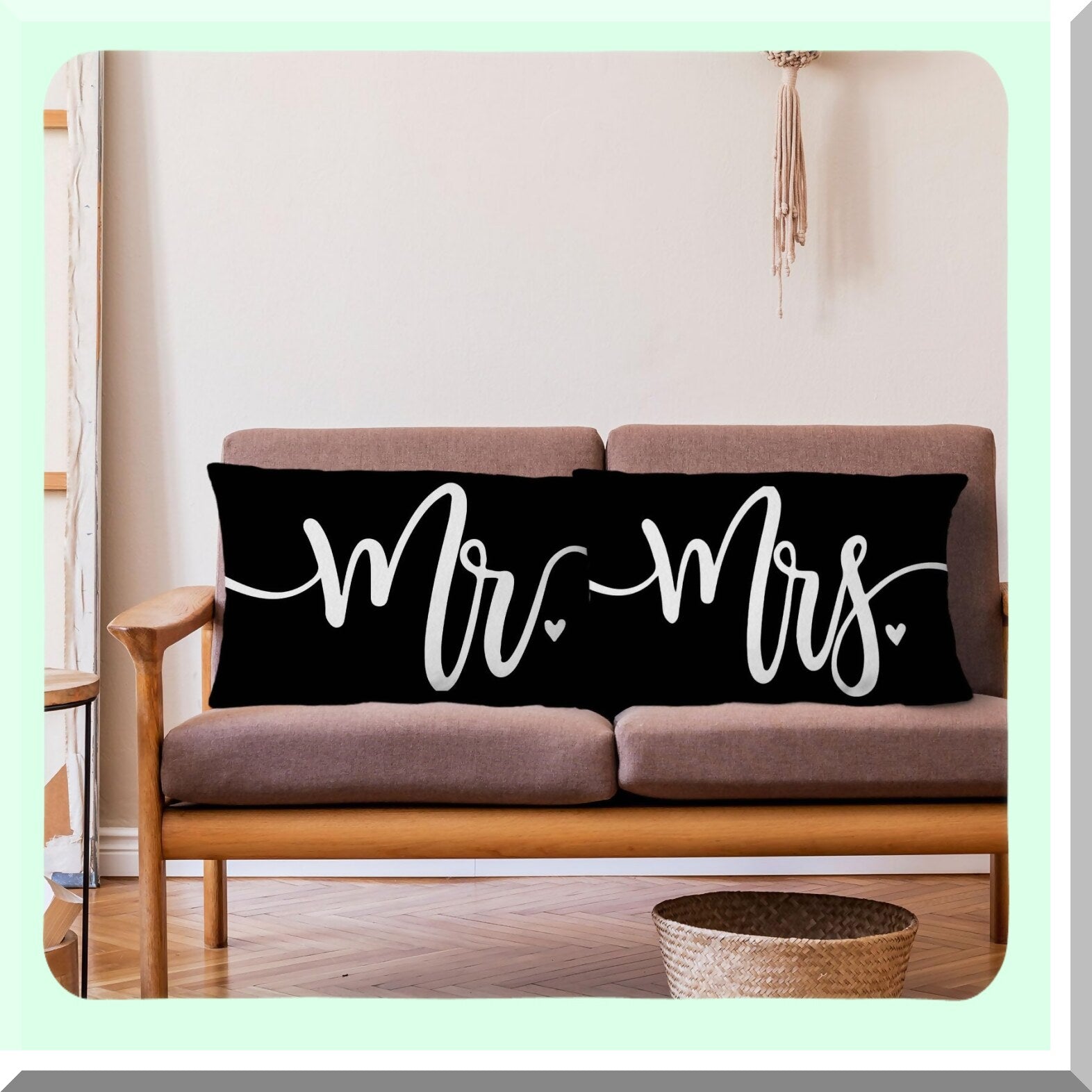 Funny Couple Cushion Cover Set - 12x20 Inch Home Decor Gift for Couples - Black Wedding Pillow Case Pair - Mr. and Mrs. Gift Ideas